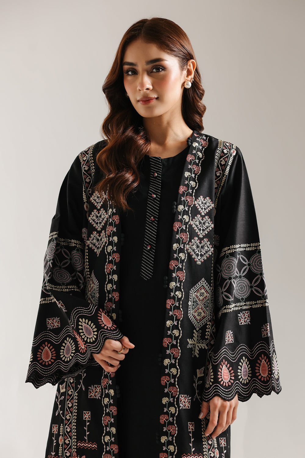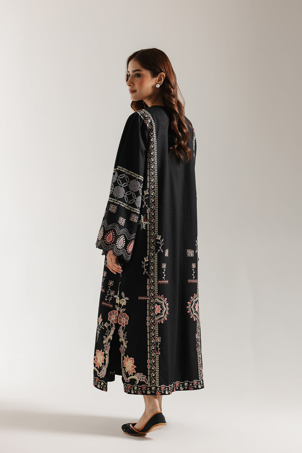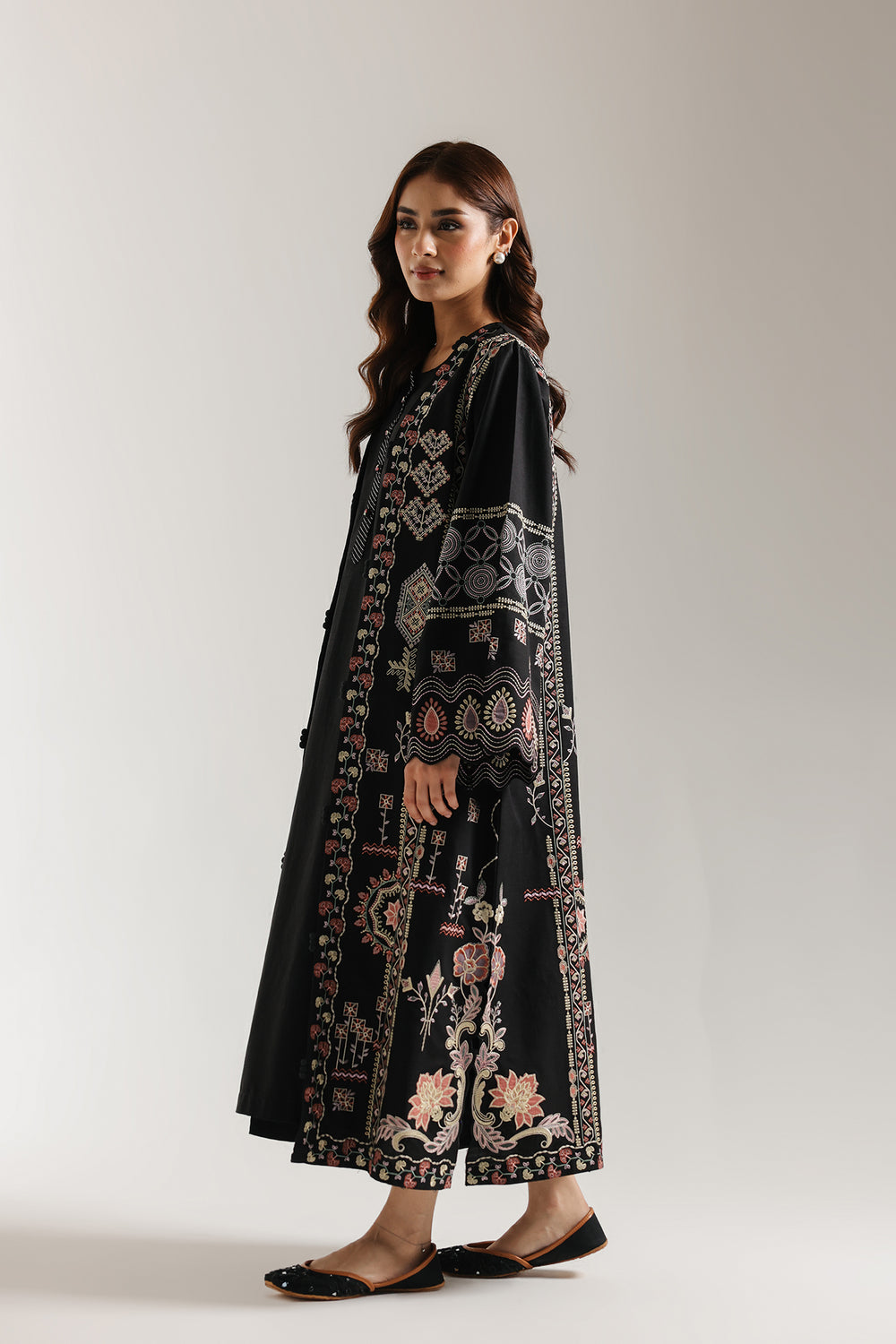 Crafted with meticulous attention to detail, this elongated front open shirt exemplifies refined artisanal excellence. The fabric presents a sophisticated composition of intricate floral and geometric motifs in a curated palette of rich, saturated tones. A refined front open silhouette, with voluminous sleeves feature precisely embroidered designs, creating visual sophistication and structural harmony. Paired with a solid inner shirt enhanced with thread details and beaded buttons, this classically elegant outfit is a perfect option for formal events this winter season.