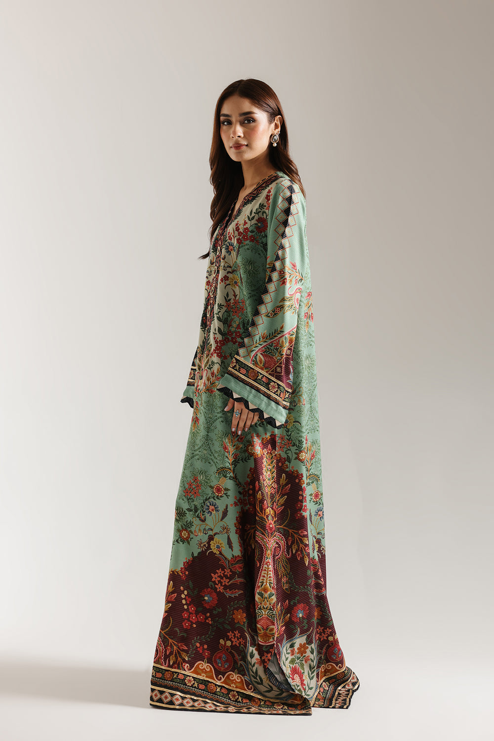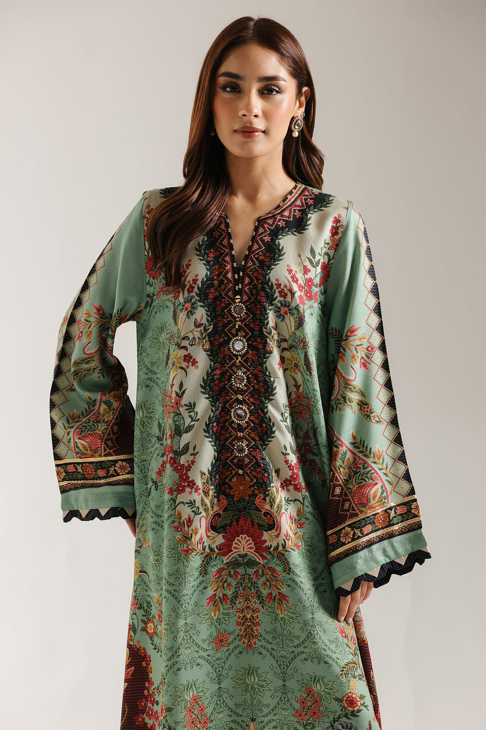 This elegant elongated shirt brings traditional artistry to life with its captivating design. The fabric showcases an intricate all-over print featuring delicate floral and geometric pattern border portrayed in vibrant tones. The neckline stands out as a striking feature, displaying vibrant two tones black and gold lace with decorative croshia mirror rings for added charm. Wide sleeves and the hemline are bordered with zig zag trims, creating a balanced, eye-catching look. Perfect for celebrations or special occasions, this shirt blends timeless patterns with festive colors in a comfortable, flowing silhouette.