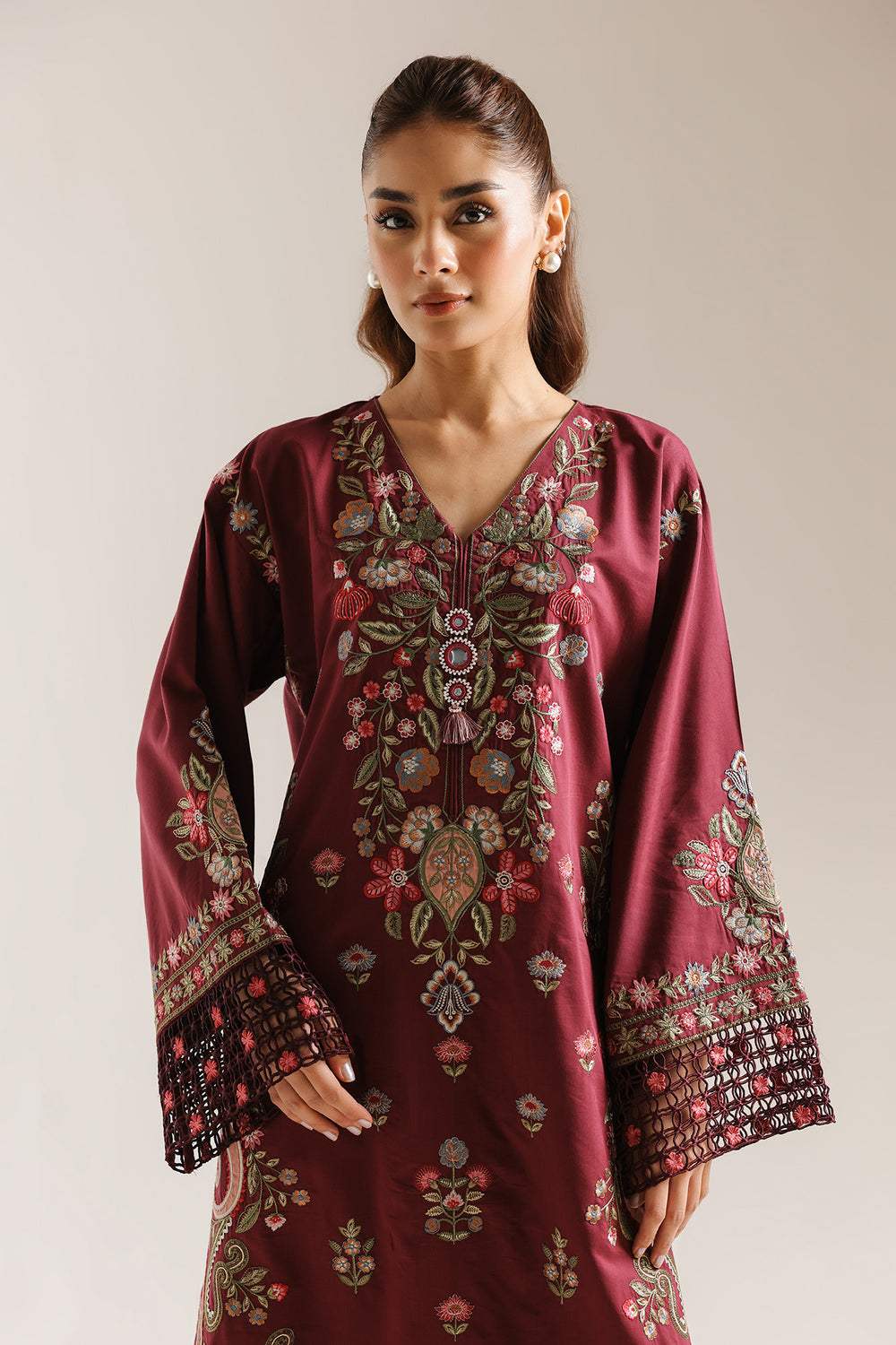 This meticulously crafted embroidered shirt exemplifies refined artisanal technique. The rich plum purple foundation provides an elegant canvas for intricate floral and vine motifs rendered in complementary vibrant tones. Each embroidered element demonstrates precision and attention to detail, resulting in a sophisticated aesthetic that transcends seasonal trends. The generously cut silhouette offers both comfort and grace, making this piece an exceptional selection for formal gatherings and discerning occasions where quality craftsmanship is valued.
