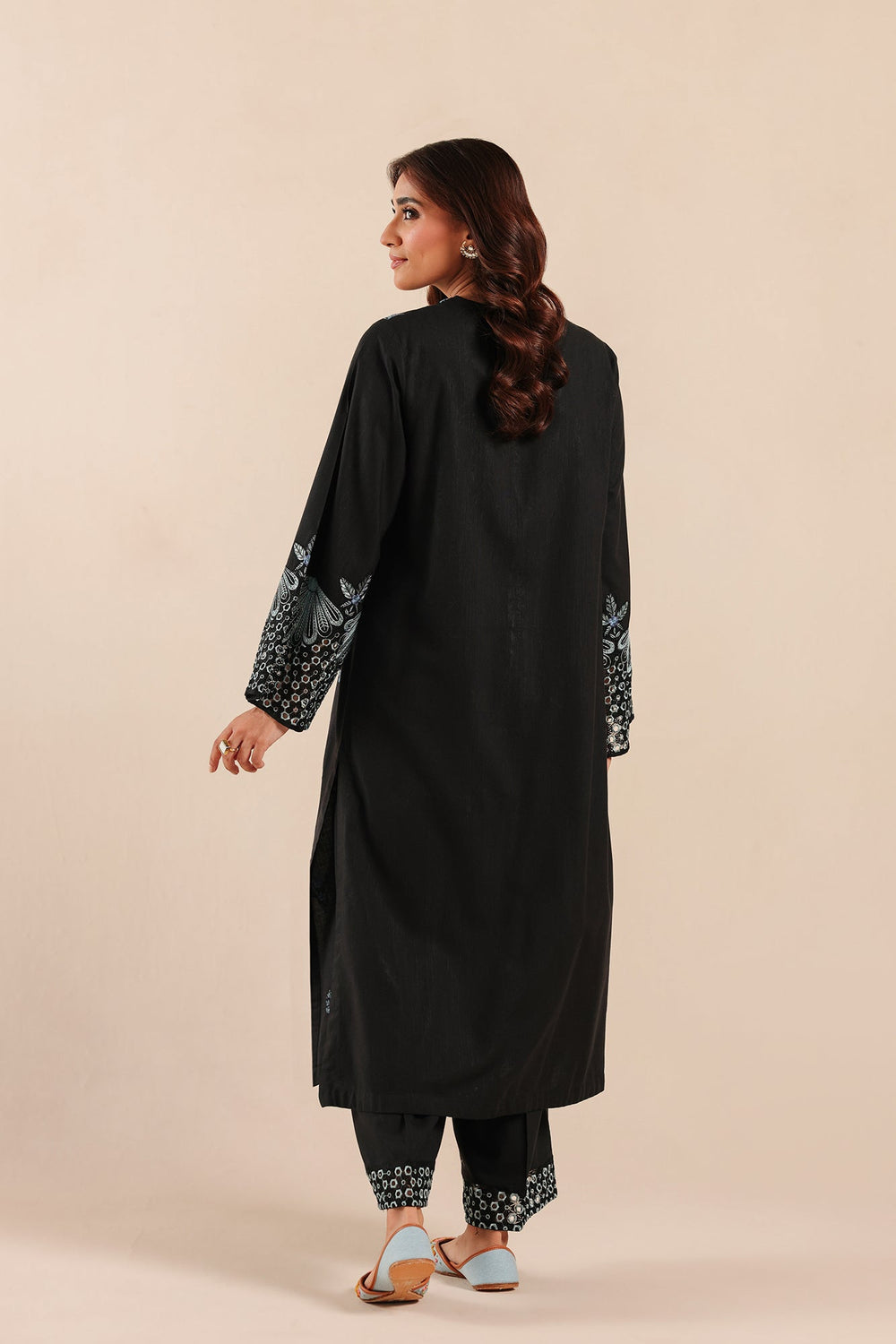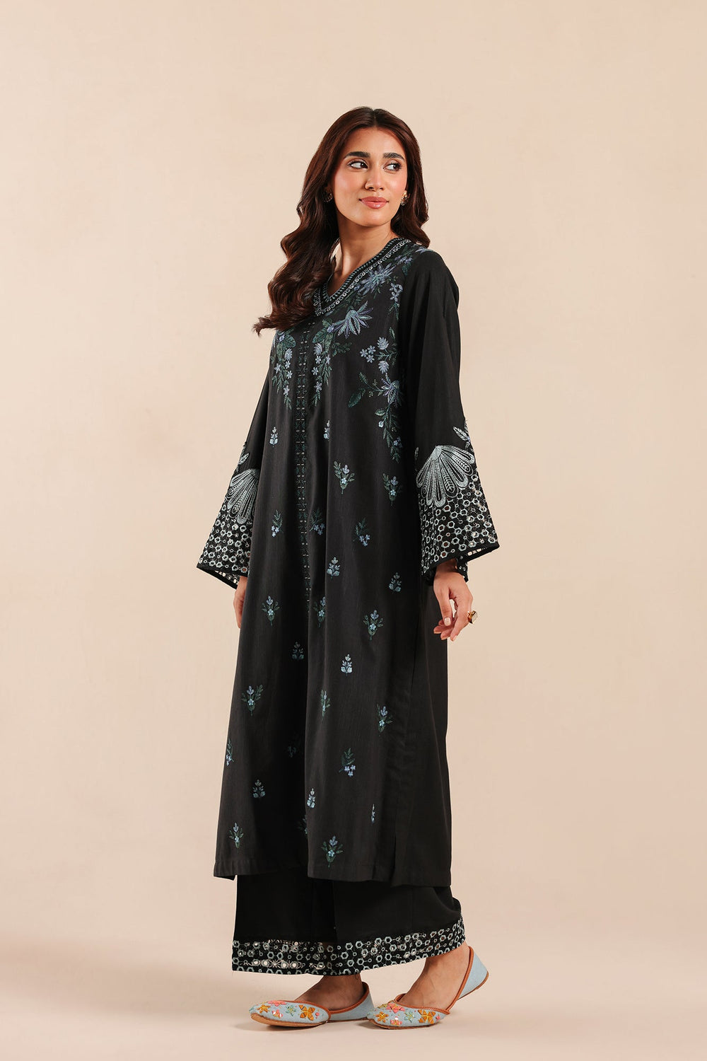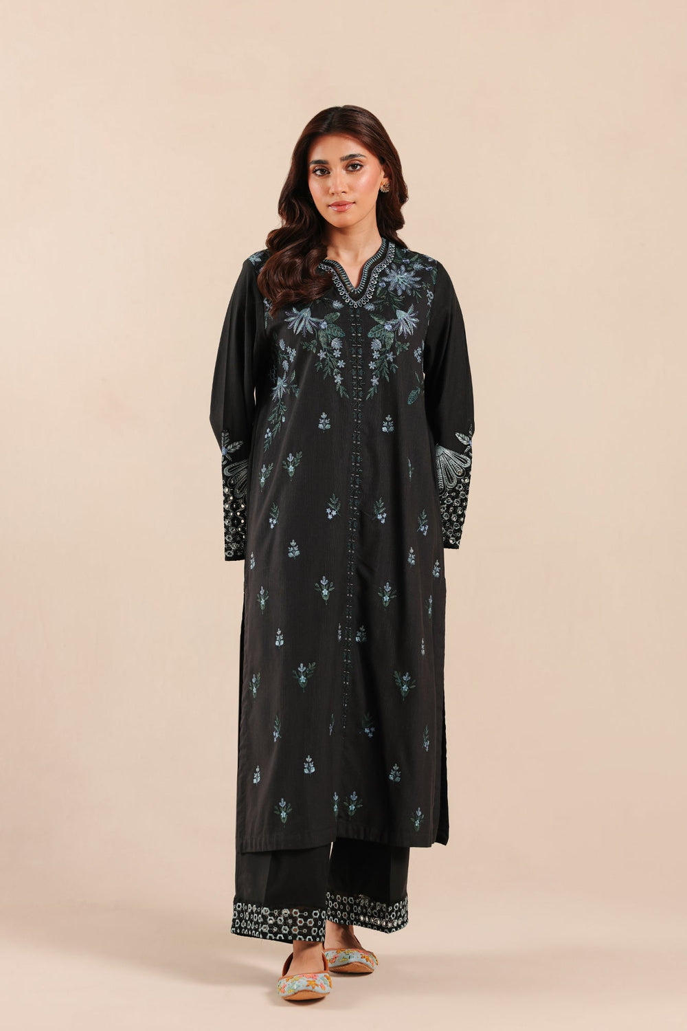This alluring outfit is the perfect mix of elegance and charm. Its deep black shirt is enhanced with beautiful floral embroidery in refreshing shade of blue illustrating mesmerizing designs with cutwork details at sleeves opening Completing the graceful outfit with a contemporary embroidered culotte trouser for a gorgeous overall look to style this season.