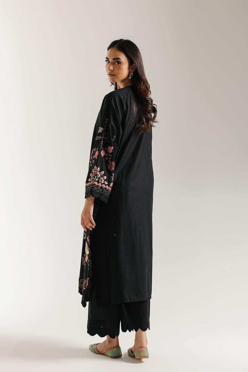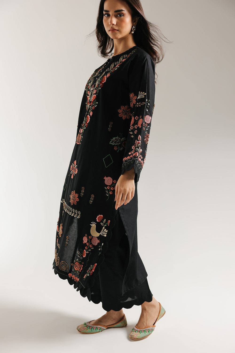 Unveil true festive glamour in this gorgeous black embroidered suit. The long, A line kurta is a stunning canvas of deep black, lavishly adorned with vibrant multi-colored floral thread embroidery. The intricate work, featuring shades of red, pink, green, and coral, is concentrated around the V-neckline and yoke and extends into bold, stylized floral and folk motifs across the entire shirt. The wide sleeves and hem are finished with a delicate scalloped cutwork border, adding an extra layer of exquisite detail. The ensemble is completed by coordinating black trouser that feature a matching scalloped embroidered hem, ensuring a cohesive and utterly luxurious traditional look.