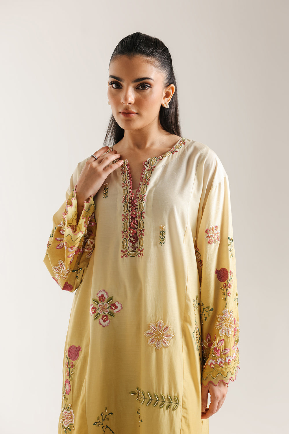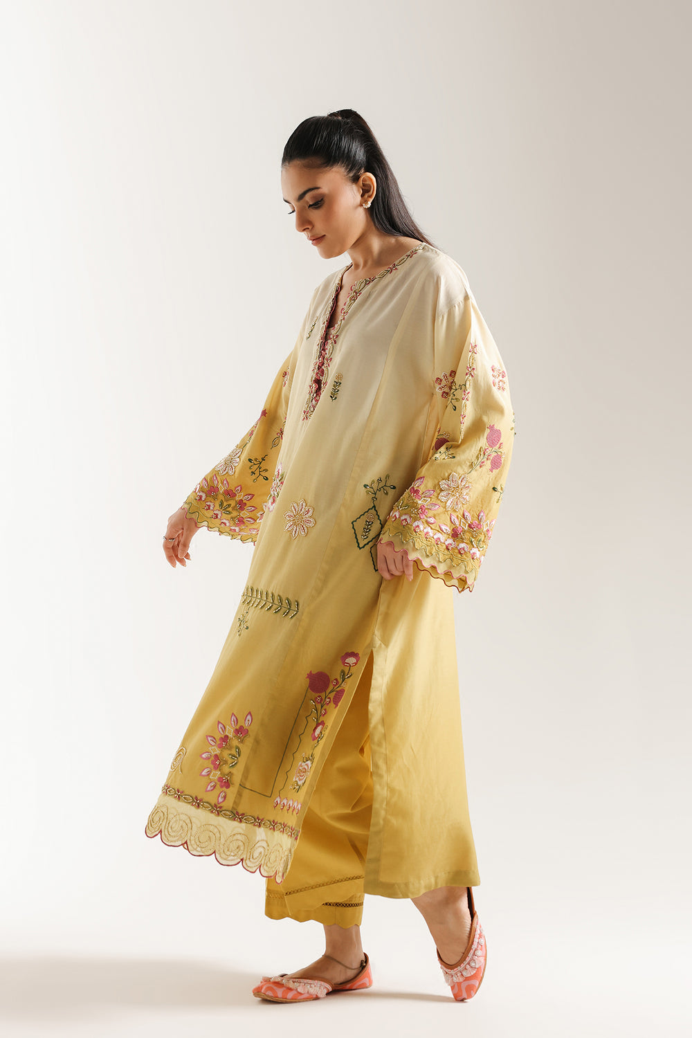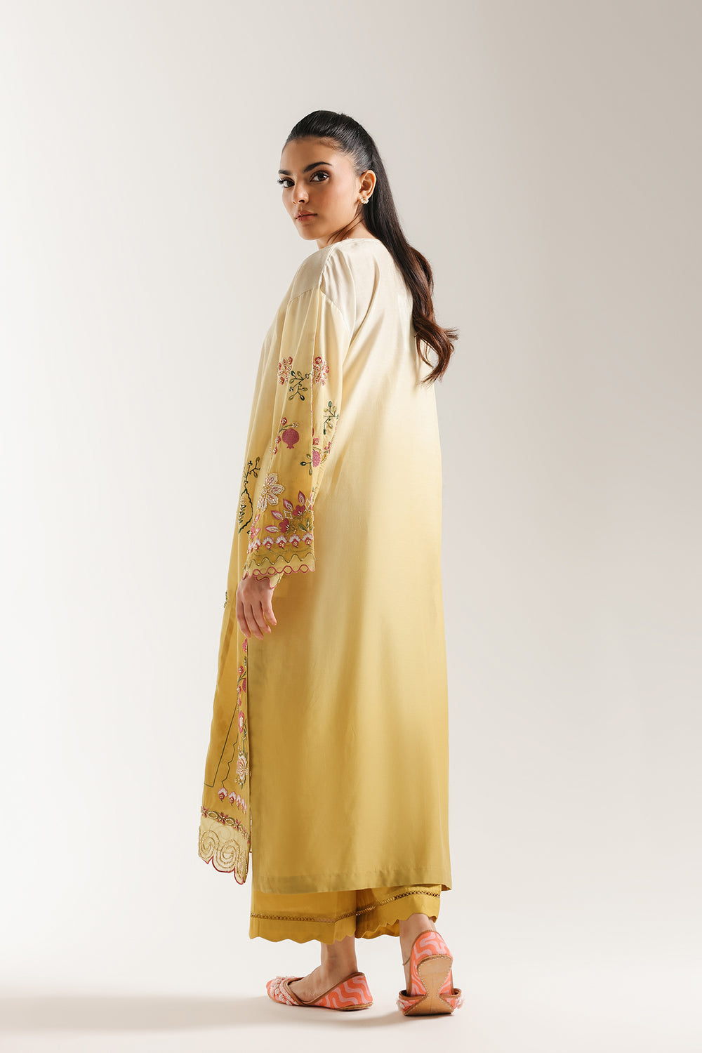 This elegant suit features a soothing gradient of cream and soft mustard yellow, beautifully accented with intricate floral embroidery in pink and green tones. The long shirt has a graceful straight cut, complemented by a delicately embroidered neckline and sleeves that add a refined touch. The hemline showcases scalloped detailing, enhancing its feminine charm. Paired with matching culottes adorned with subtle embroidery, this ensemble exudes understated sophistication — perfect for daytime festivities or elegant casual gatherings.