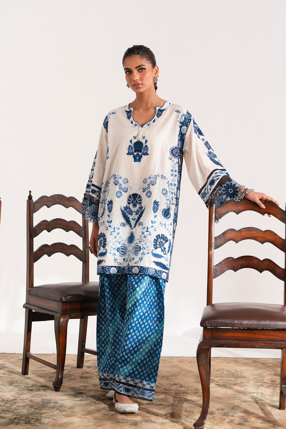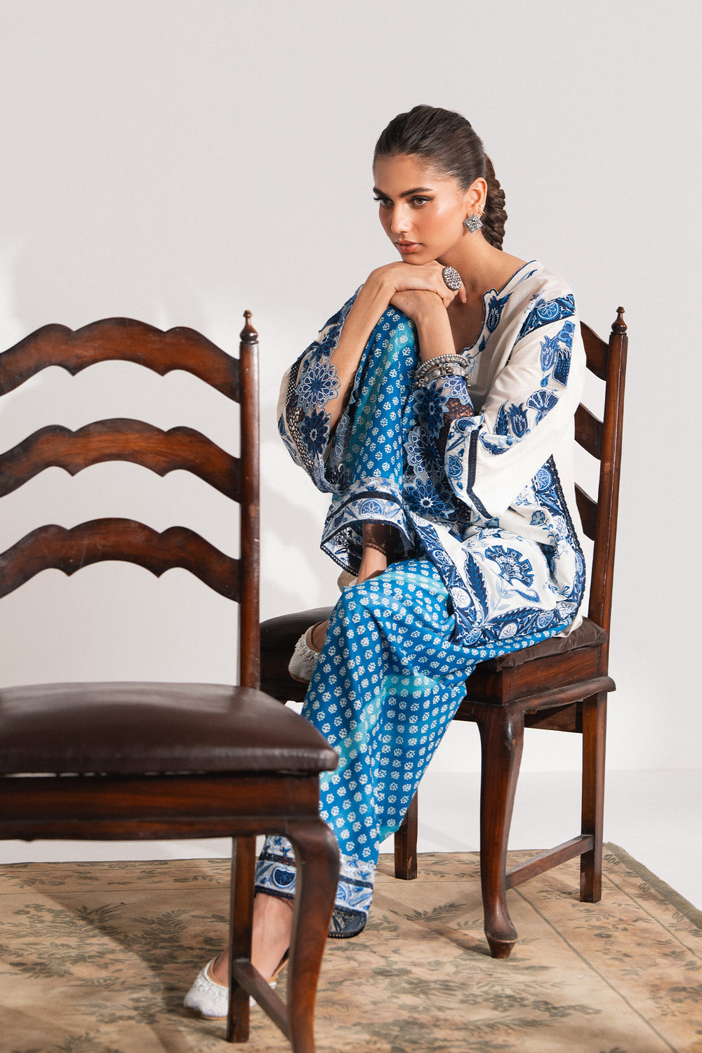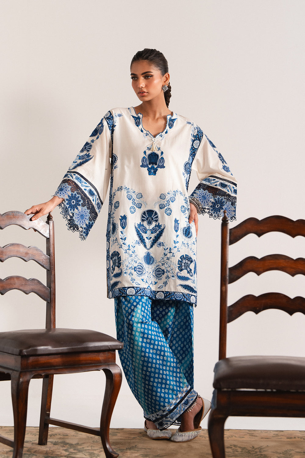 Dive into the refreshing allure of our cerulean dream suit set, a captivating blend of traditional inspiration and contemporary design. This exquisite two-piece ensemble features a off white tunic, beautifully adorned with a bold and intricate blue print that evokes classic motifs and artistic patterns. The detailed design gracefully covers the tunic, creating a visually compelling narrative. Paired with perfectly coordinated wide leg shalwar featuring a subtle, tonal geometric print, this suit offers a harmonious blend of comfort and distinct style. Ideal for making a refined statement at cultural events, daytime gatherings, or simply adding a touch of artistic flair to your daily wear.