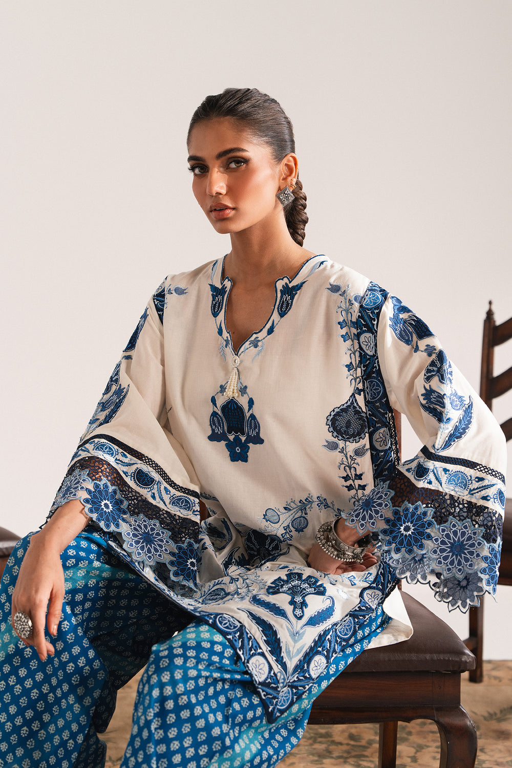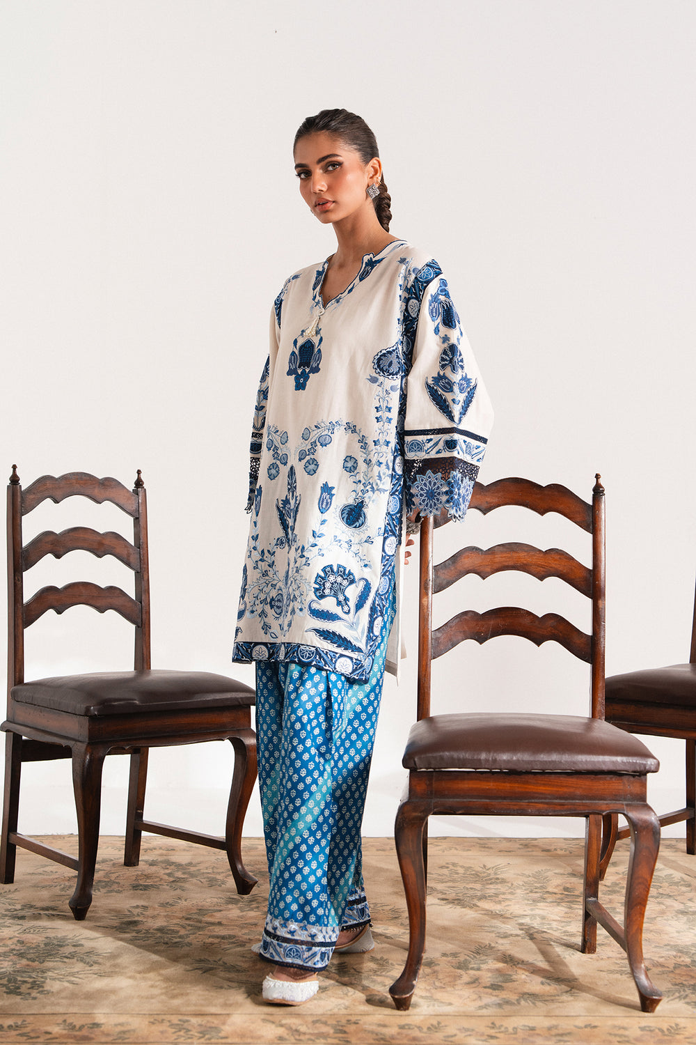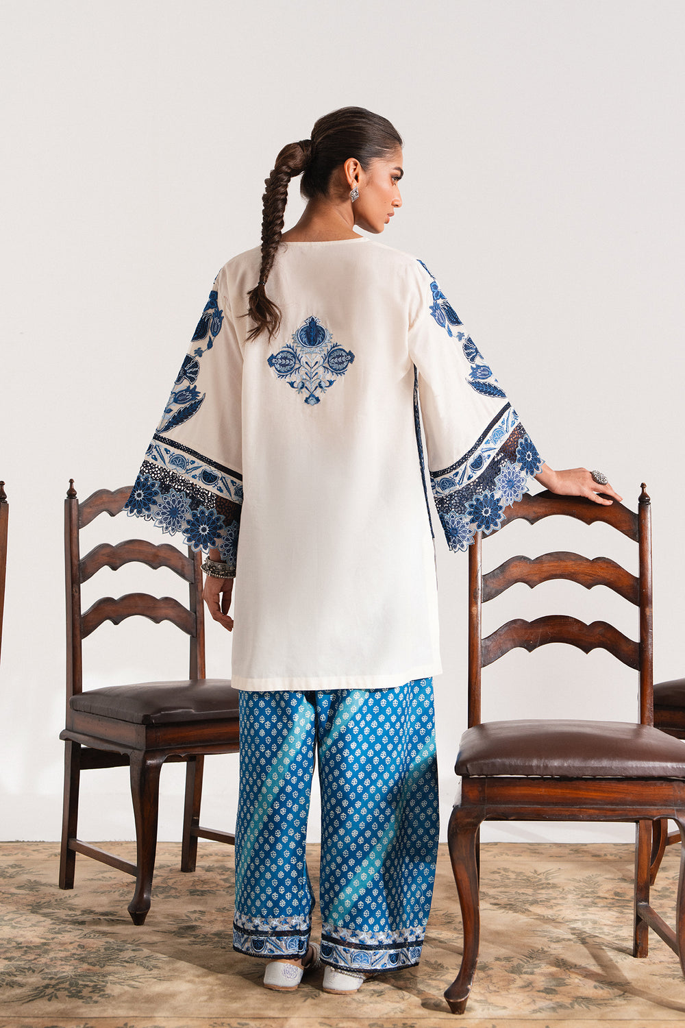 Dive into the refreshing allure of our cerulean dream suit set, a captivating blend of traditional inspiration and contemporary design. This exquisite two-piece ensemble features a off white tunic, beautifully adorned with a bold and intricate blue print that evokes classic motifs and artistic patterns. The detailed design gracefully covers the tunic, creating a visually compelling narrative. Paired with perfectly coordinated wide leg shalwar featuring a subtle, tonal geometric print, this suit offers a harmonious blend of comfort and distinct style. Ideal for making a refined statement at cultural events, daytime gatherings, or simply adding a touch of artistic flair to your daily wear.