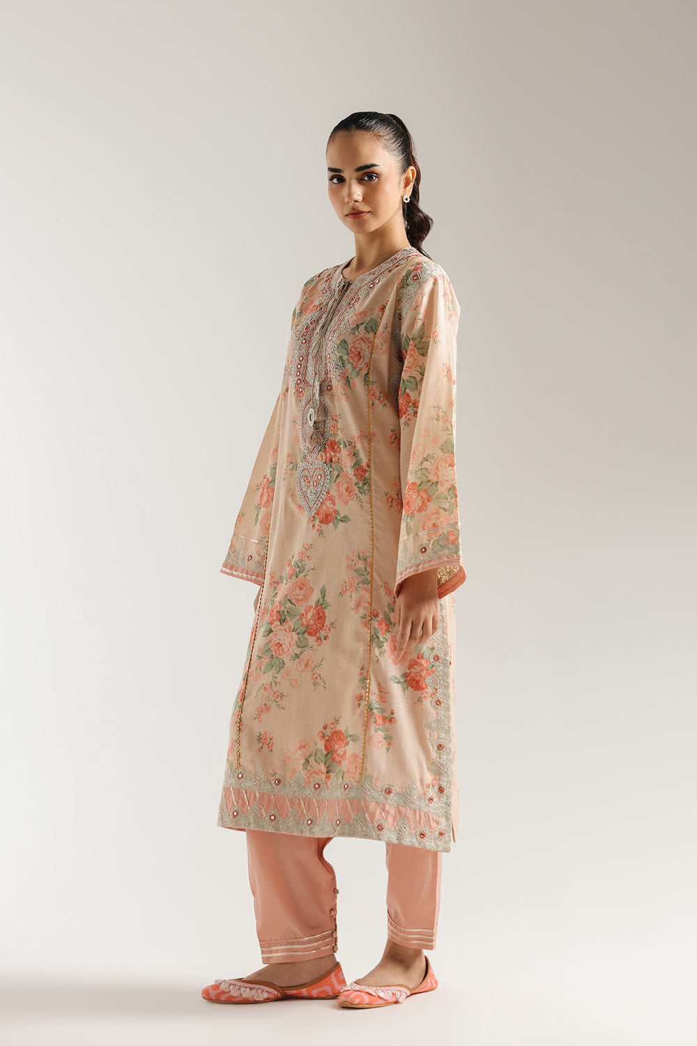 Indulge in the delicate charm of this nude-pink embroidered suit. The long, straight-cut kurta is crafted from a soft, lightweight fabric featuring an all-over photo-realistic floral print in shades of pink, rose, and green. The neckline is richly detailed with dense tonal thread and sequin embroidery, featuring elaborate heart motifs, tassels, and intricate borders. The hemline is beautifully finished with subtle gotta work. The ensemble is completed by coordinating shalwar in a matching soft pink, which feature a delicate border at the hem, offering a perfectly cohesive and feminine festive look.