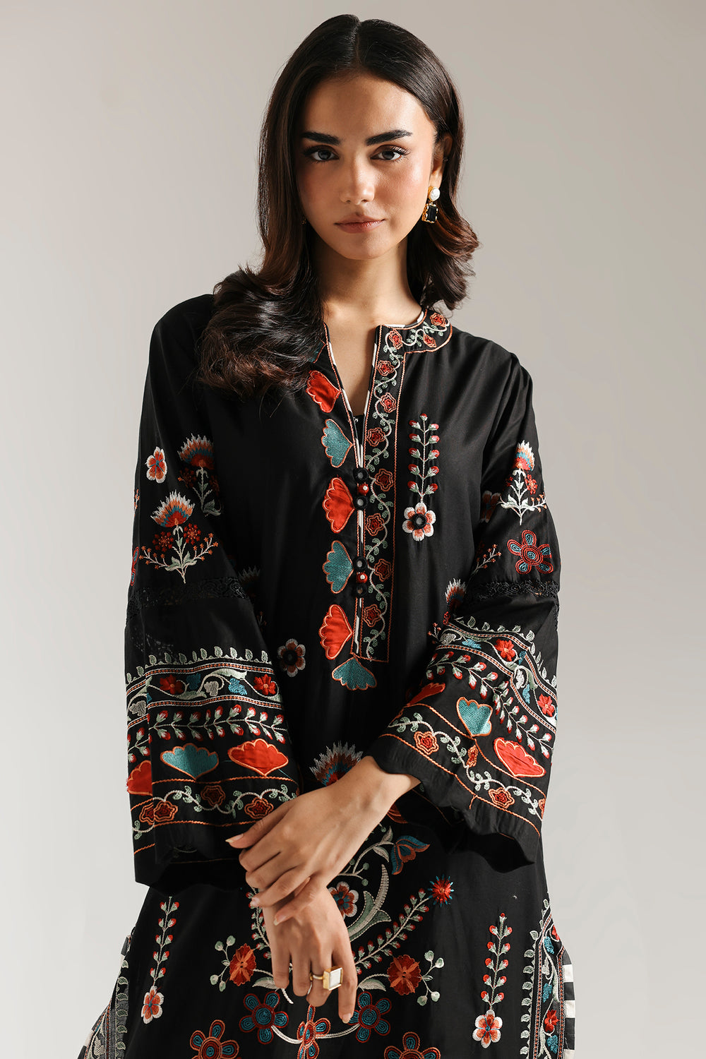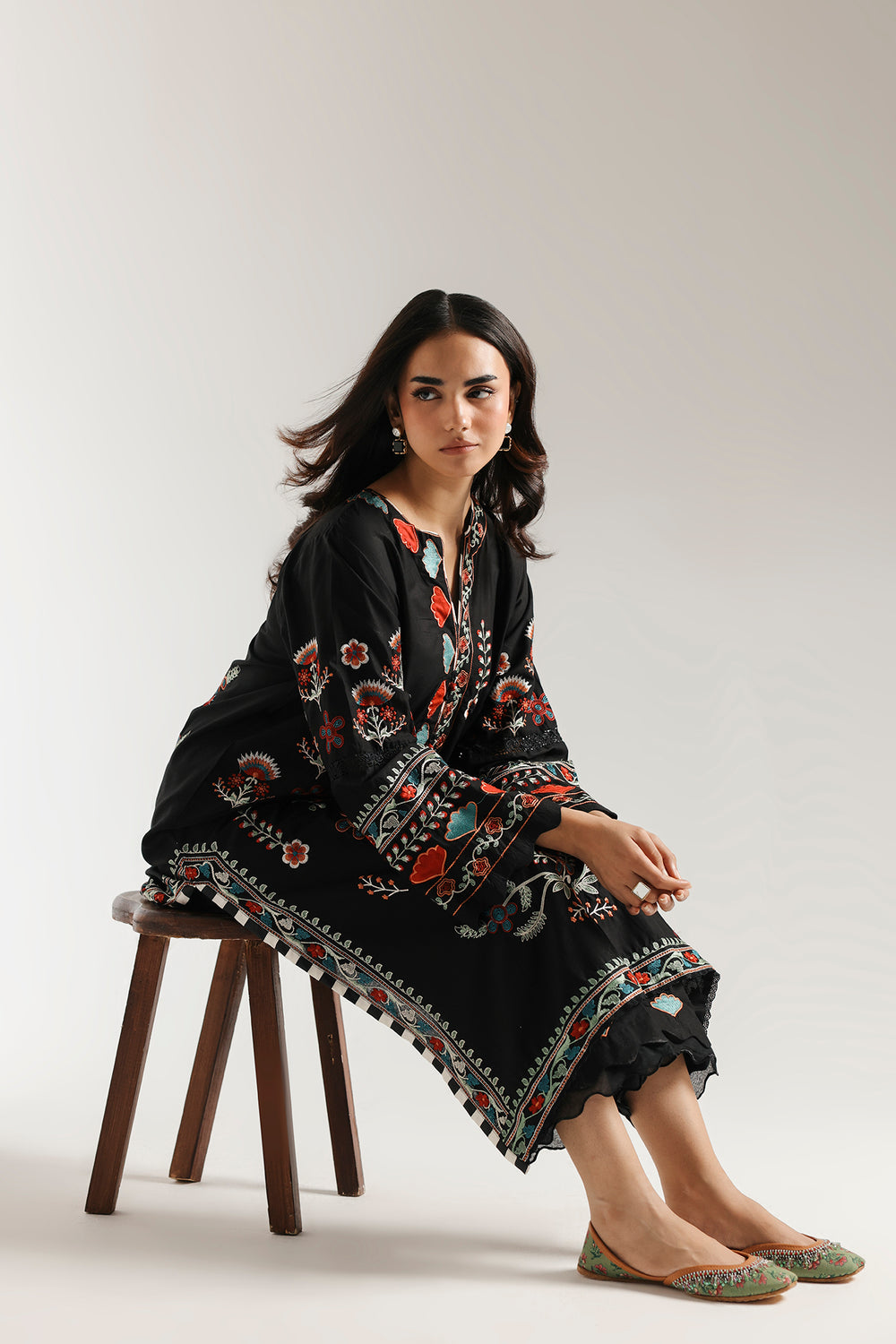 This striking embroidered suit is a captivating blend of bold color and intricate design. The long black kurta serves as a dramatic canvas for the vibrant, all-over embroidery in rich shades of red, orange, and green. With its unique folkloric patterns and a beautifully embroidered hem, this ensemble is an artistic and sophisticated choice. Paired with matching black trouser to complete the look