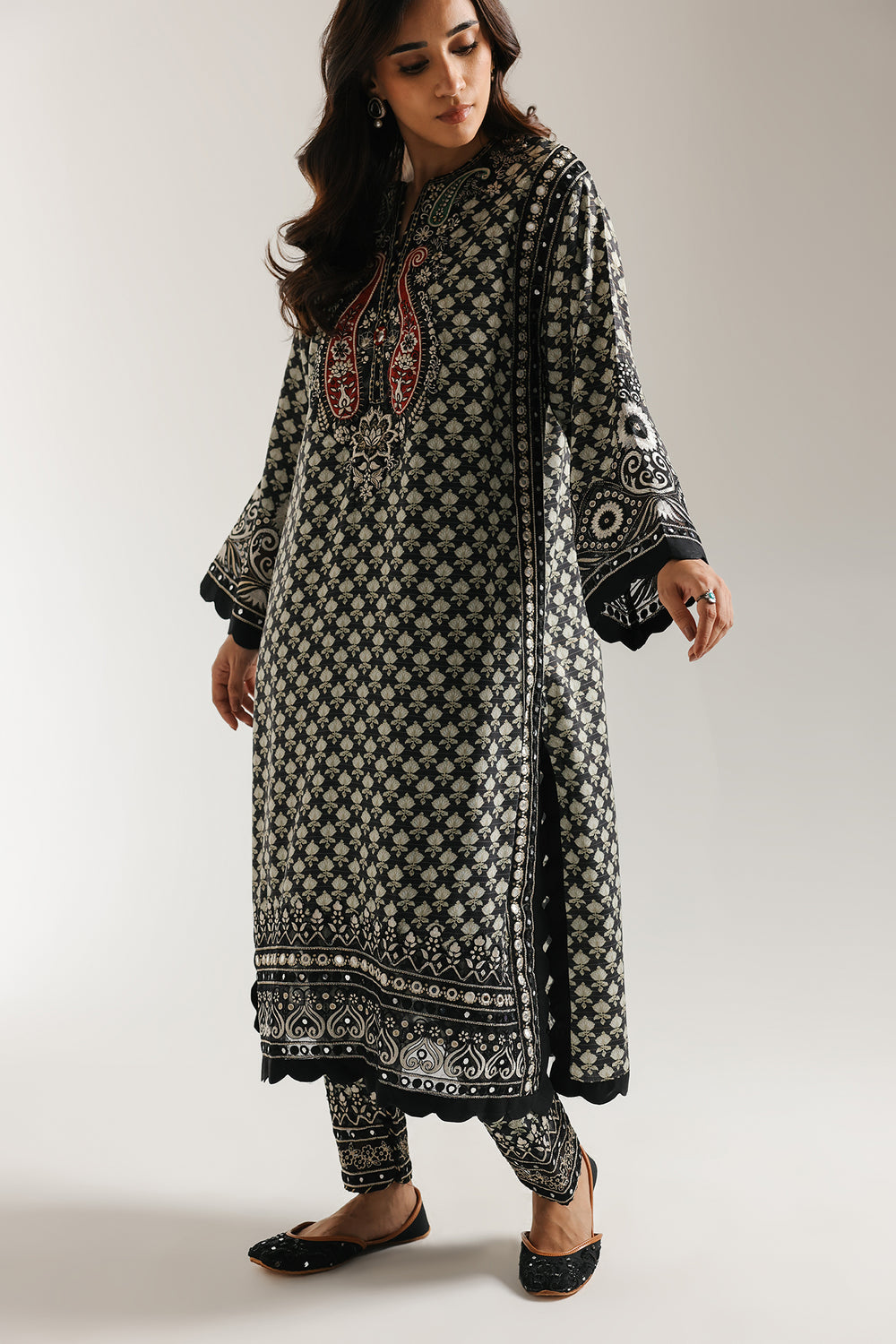 Step into dramatic elegance with this captivating black embroidered suit. The long, straight-cut kurta features an intricate all-over white geometric print that creates a dense, mesmerizing texture. The neckline is the centerpiece, adorned with rich embroidery in contrasting shades of red, green, and cream that form striking traditional motifs. The wide sleeves are finished with a beautifully scalloped cuff, mirroring the detailed hemline. The ensemble is perfectly completed by tailored shalwar that carry a coordinating, intricate print and is finished with matching embroidered hem, creating a stunning and cohesive look.
