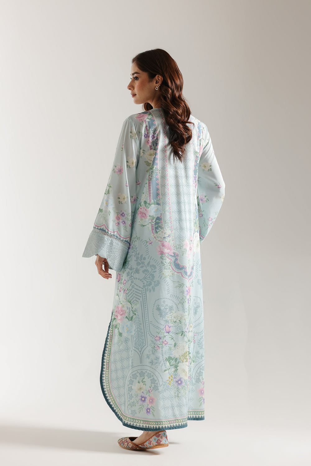 Soft pastel green embroidered shirt with graceful, flowy sleeves and extended length, designed for an elegant silhouette. The intricate embroidery adds a touch of traditional charm to this piece. Paired with plain matching trousers for a coordinated, polished look. Perfect for casual gatherings, celebrations, or everyday wear. The flowing design ensures comfort while maintaining a refined appearance.