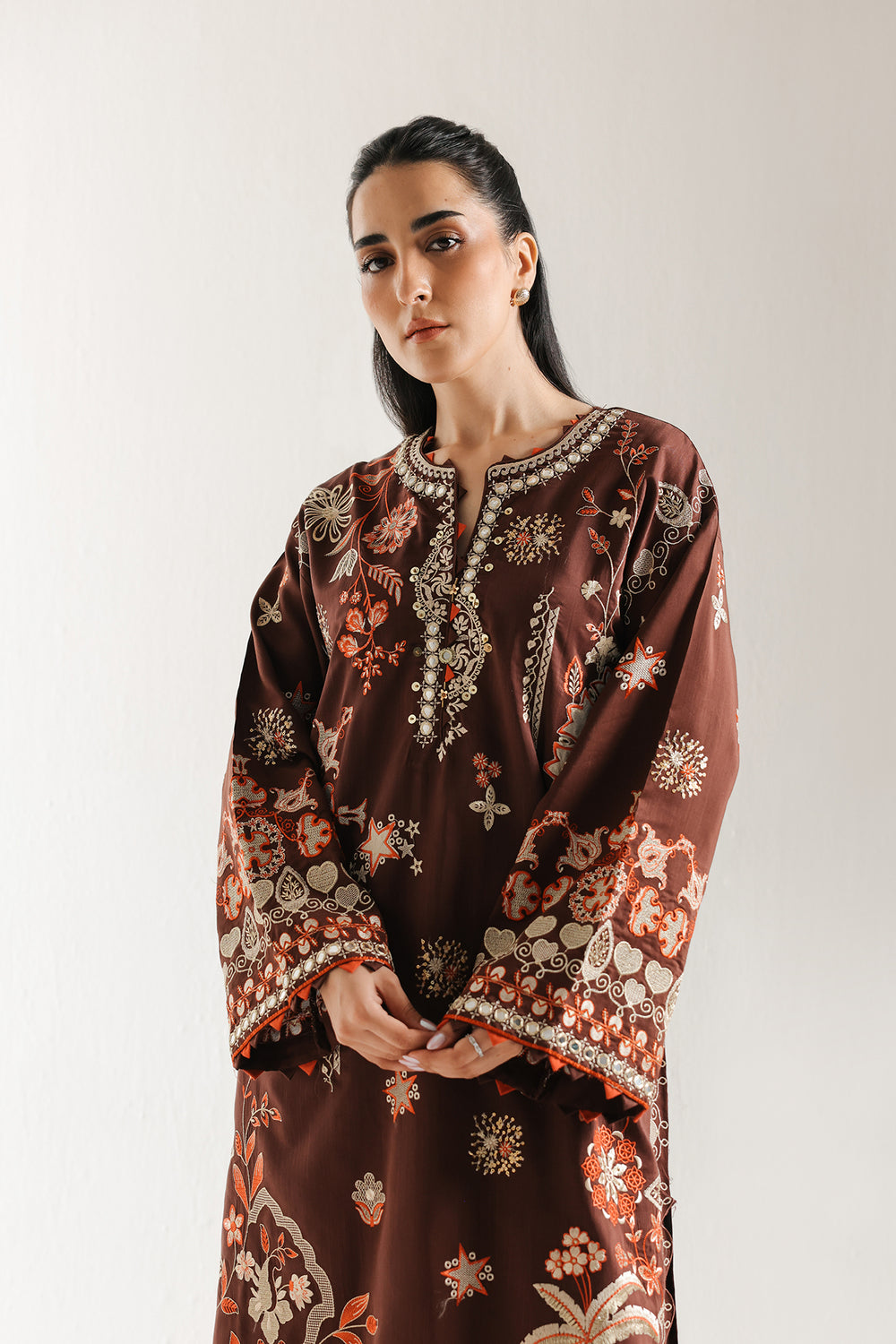 Capture the warmth of autumn with this rich brown embroidered suit. The long, straight-cut kurta is crafted from a deep brown fabric and features exquisite thread embroidery in shades of coral, white, and earthy greens. The intricate design includes symmetrical floral patterns and unique motifs that cover the front panel and wide sleeves. The V-slit neckline is adorned with fine detailing, and the hem and sleeves are finished with a delicate scalloped edge. The ensemble is perfectly matched with coordinating trousers that feature embroidered borders at the hem, creating a harmonious and striking traditional look.