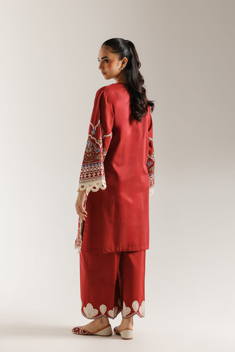 Immerse yourself in the traditional opulence of this stunning deep red embroidered suit. The short, A line kurta is lavishly adorned with vibrant multi-colored thread embroidery, featuring bold floral and botanical motifs in striking white, light blue, and green hues. A delicate white scalloped lace cutwork trim elegantly frames the flared sleeves and hem, providing a beautiful, contrasting border. The ensemble is perfectly completed by coordinating wide-leg trouser that feature the exact same intricate embroidered lace border at the hem, delivering a luxurious and cohesive traditional statement.