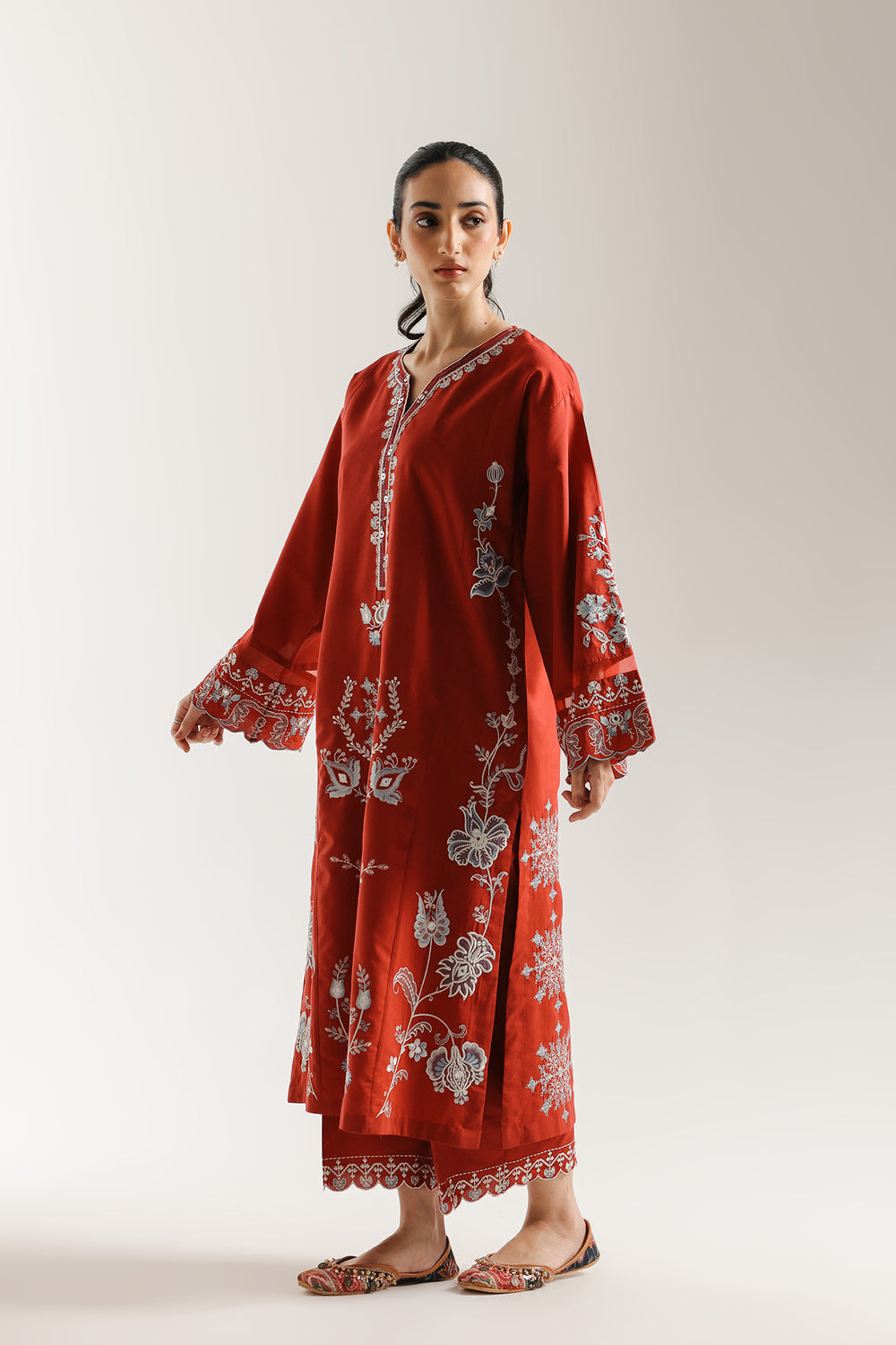 Command attention in this breathtaking rust-colored embroidered Suit. The long, straight-cut kurta is a magnificent display of artistry, adorned with intricate embroidery in detailed floral and stylized geometric patterns that cover the entire front, neckline, and cuffs of the wide, flowing sleeves. The ensemble is perfectly matched with tailored trousers in the same rich hue, which feature subtle embroidery detailing at the hem, creating a powerfully cohesive and traditional look that is ideal for any grand occasion.