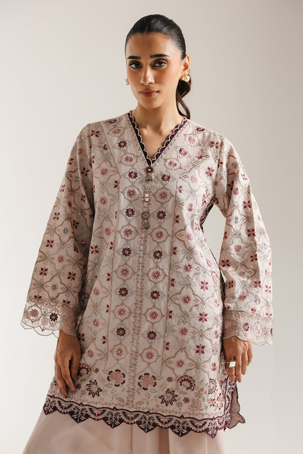 Capture serene, romantic elegance with this beautiful muted rose embroidered suit. The short, straight-cut kurta is crafted from a light fabric and features delicate, all-over white and deep mauve floral thread embroidery. The embroidery forms a beautiful, repeating geometric and floral pattern, providing subtle texture and visual interest. The V-slit neckline is adorned with a row of decorative accents, while the wide sleeves and hem are finished with a delicate scalloped edge. The ensemble is paired with flowing wide-leg culottes trouser in a matching muted rose color, creating a graceful, ethereal silhouette.