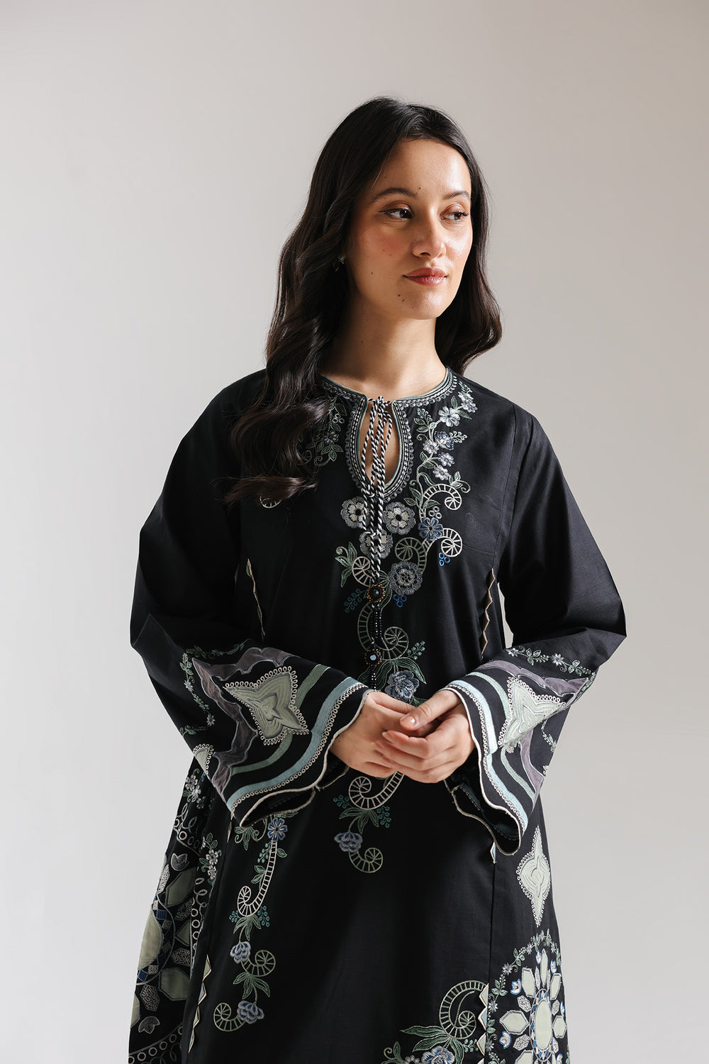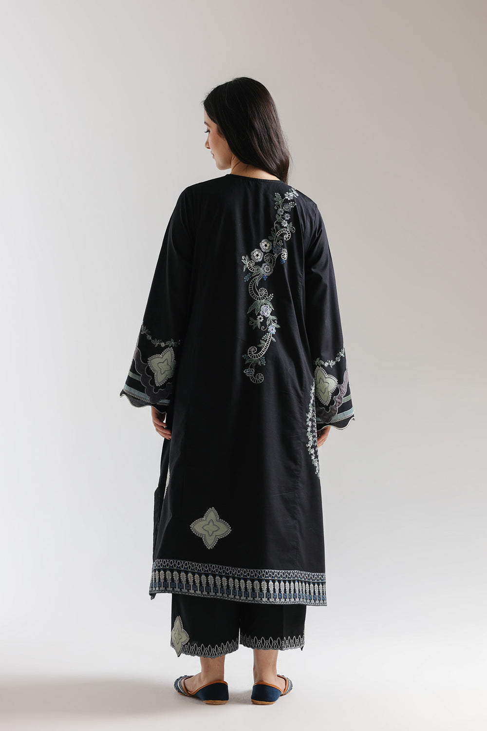 This sophisticated two-piece features a black shirt adorned with delicate embroidery in pale blue, mint green, and off-white tones, showcasing intricate floral and Kashmiri paisley motifs. While the main body displays sparse, understated detailing, the hemline showcases densely embroidered ornamentation for striking visual impact. The kurta features a classic round neckline with a subtle keyhole detail, paired with cropped trousers that complete the polished silhouette. Perfect for formal occasions, celebrations, or elevated everyday wear.