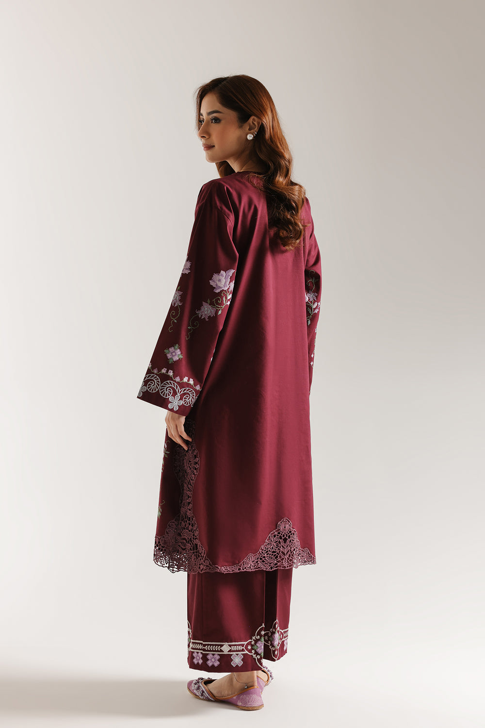 Elevate your seasonal wardrobe with this sophisticated violet embroidered suit, where traditional craftsmanship meets modern design sensibilities. The A-line kurta showcases an expertly executed composition of cross stitch embroidery and cutwork embroidery across both front and back panels, creating dimensional visual interest. Croshia mirror embellishments grace the front placket neckline, introducing artisanal detailing that distinguishes this piece. Complemented by coordinating culotte trousers featuring embroidered border near hem, this ensemble delivers a refined balance of heritage aesthetics and contemporary elegance—ideal for those who appreciate nuanced, quality-driven fashion.