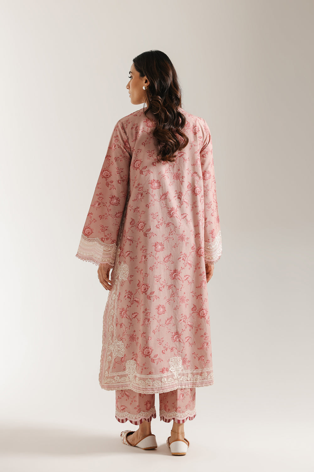 Indulge in the delicate beauty of this dusty rose embroidered suit. The long, A line-cut kurta is crafted from a soft fabric featuring an elegant monochrome floral print that covers the entire silhouette. The traditional band collar and slit neckline are beautifully highlighted with shimmering stones and intricate white thread embroidery. The wide sleeves and hem are finished with delicate cut-work lace, adding a touch of sophisticated femininity. The suit is perfectly completed with matching shalwar that feature delicate embroidery at the hem, creating a graceful and ethereal traditional look.