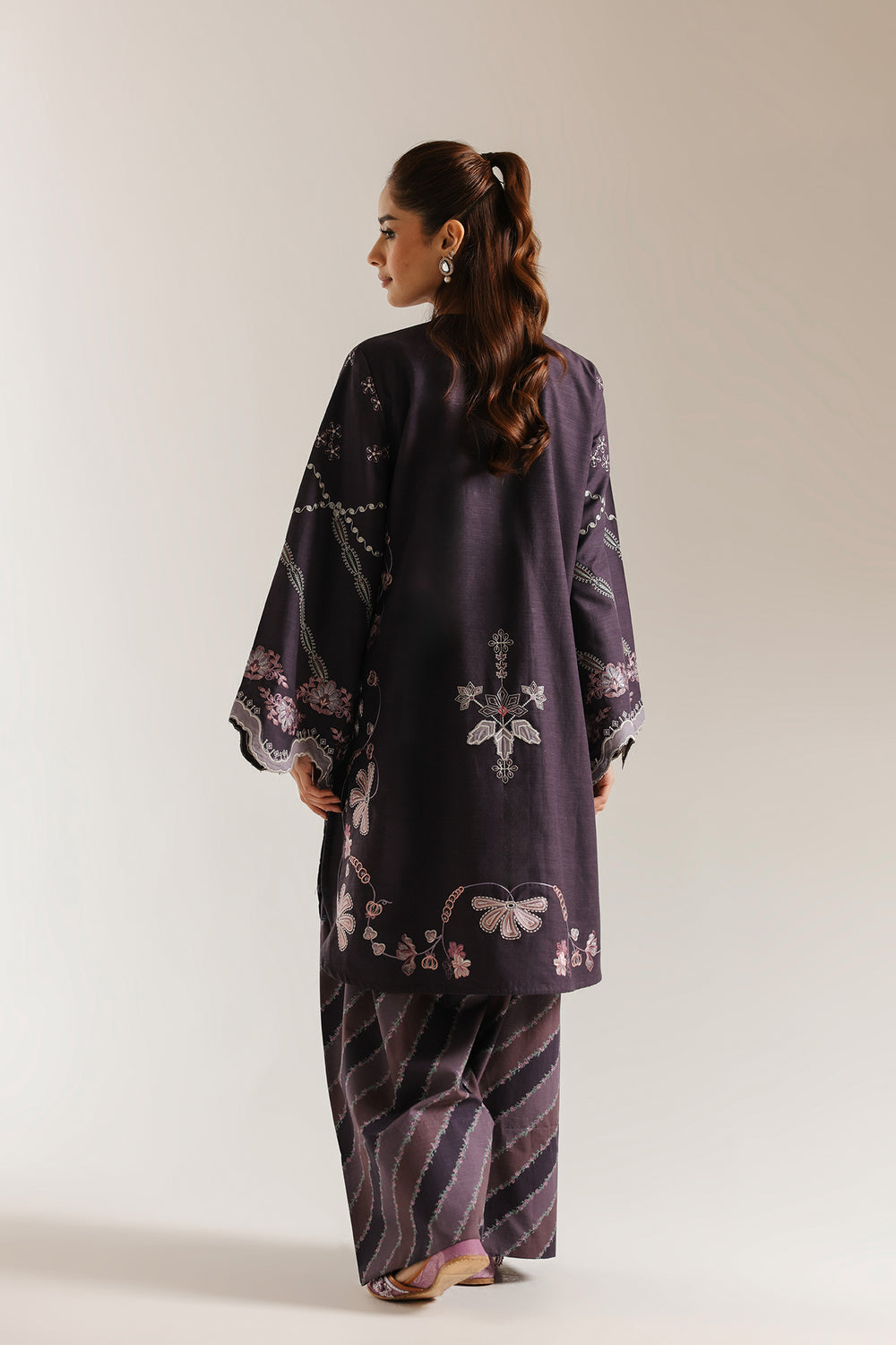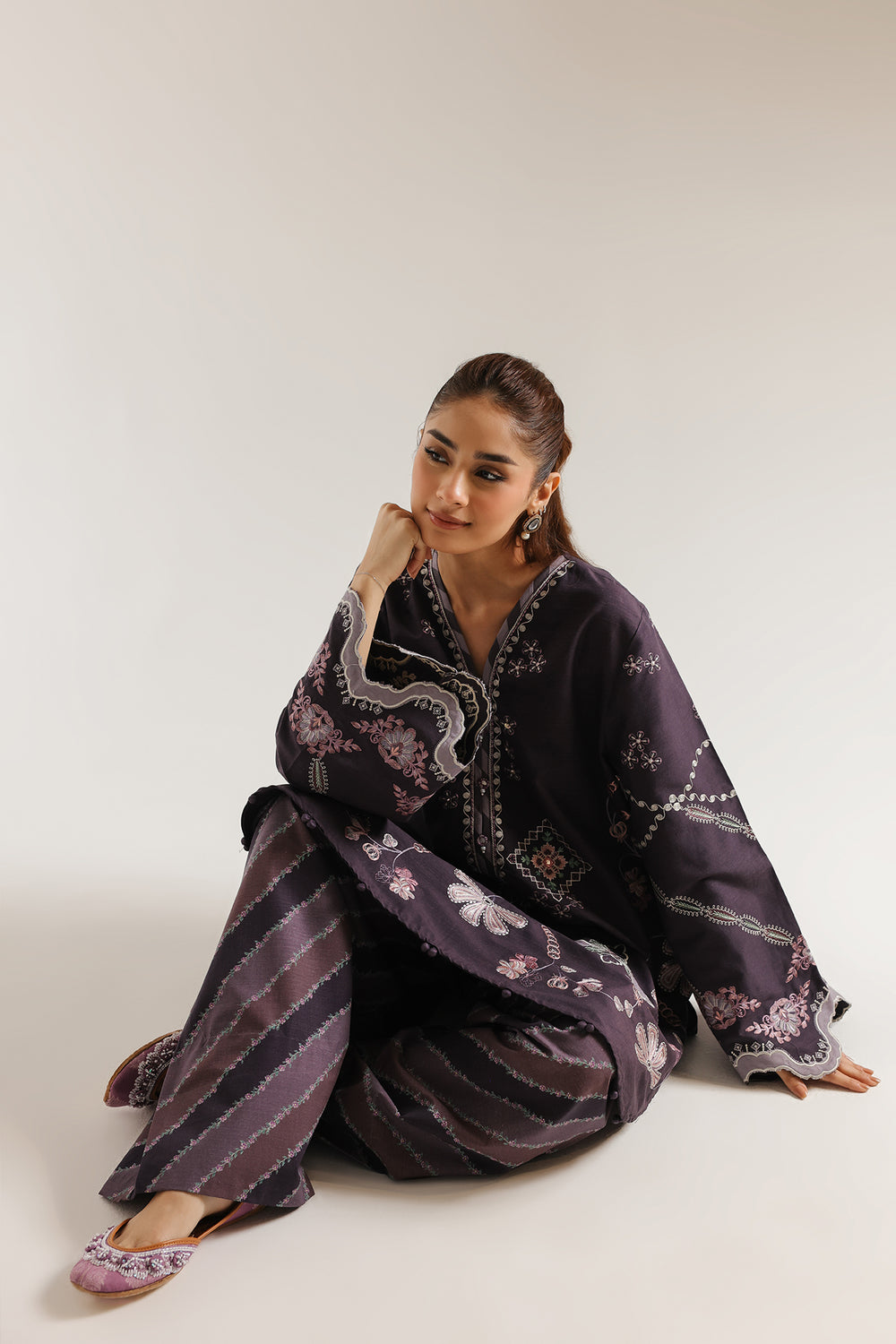 This refined embroidered suit combines traditional craftsmanship with modern sensibility. The deep purple shirt features meticulous embroidery work and a flattering V-neckline, while the coordinated farshi shalwar showcases delicate line patterns printed throughout. The charming color palette offers remarkable versatility with intricate embroidery illustrating floral motifs. Each piece demonstrates superior construction quality and attention to detail, a distinguished selection for those who appreciate understated sophistication in contemporary traditional wear.