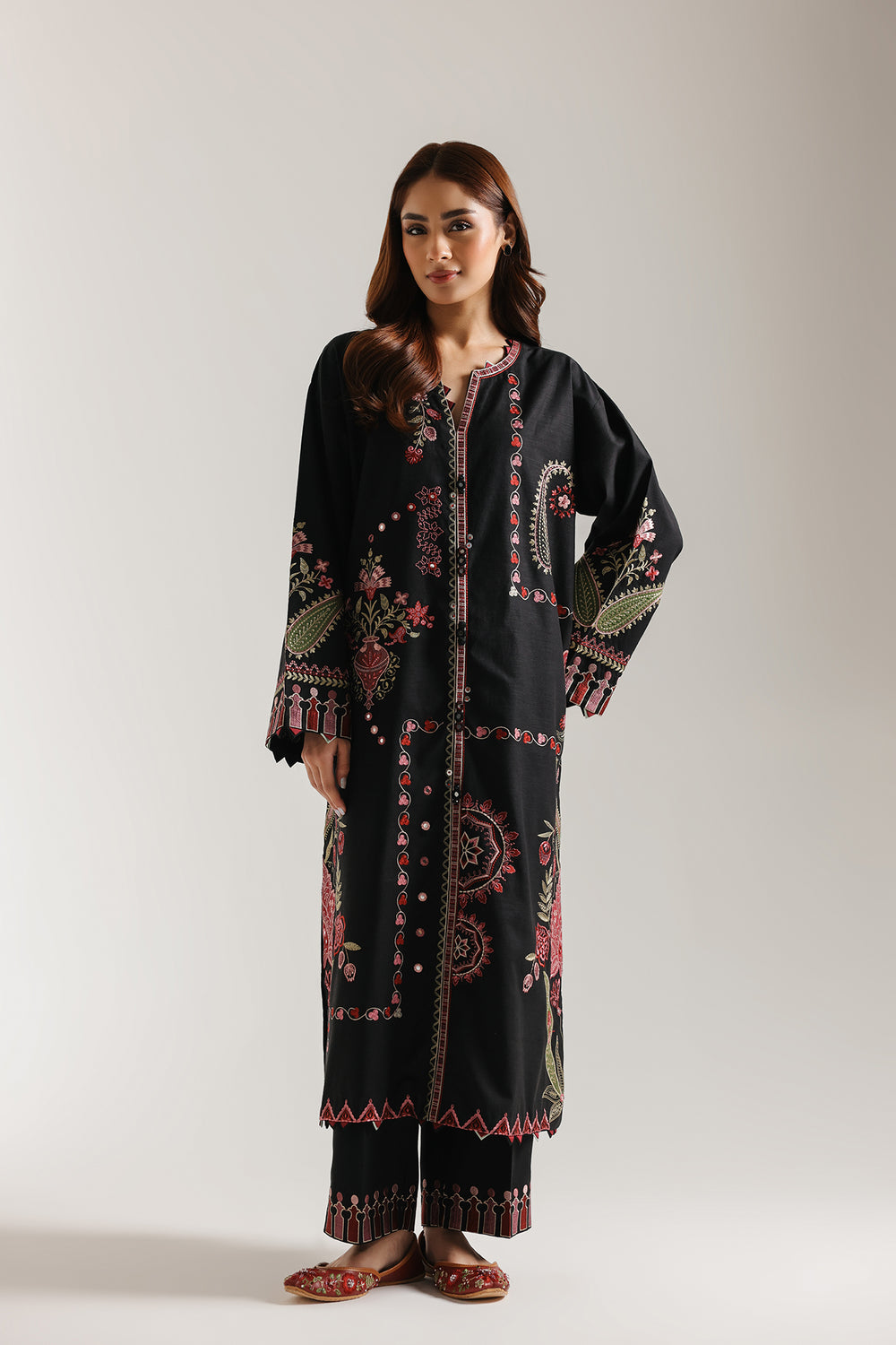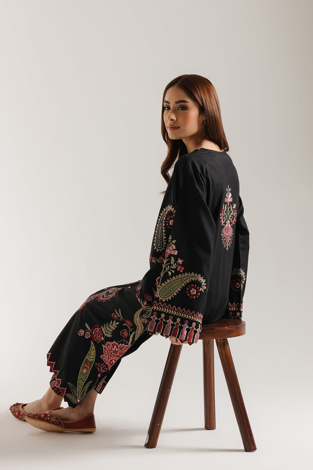 Elegant embroidered shirt and trouser set in rich jet black, featuring intricate paisley and motif designs. Perfect for everyday wear, this comfortable suit combines traditional craftsmanship with modern style. The detailed embroidery adds sophistication to your daily wardrobe, making it ideal for casual gatherings and regular occasions.