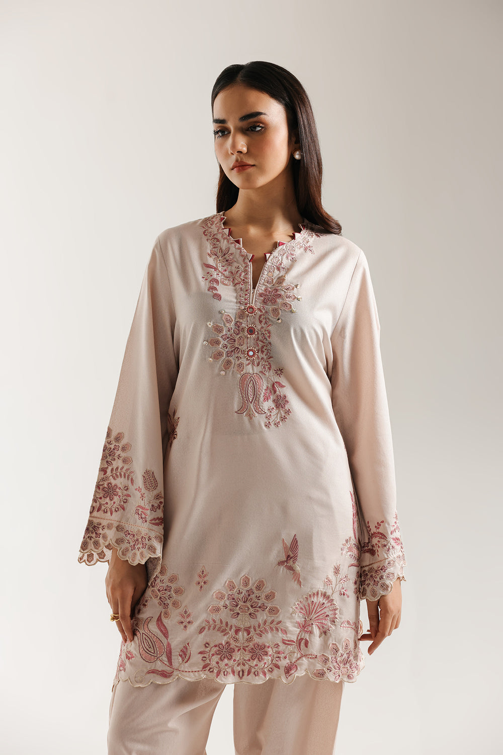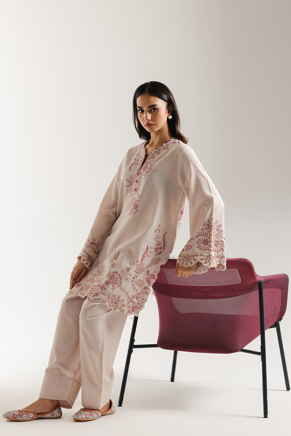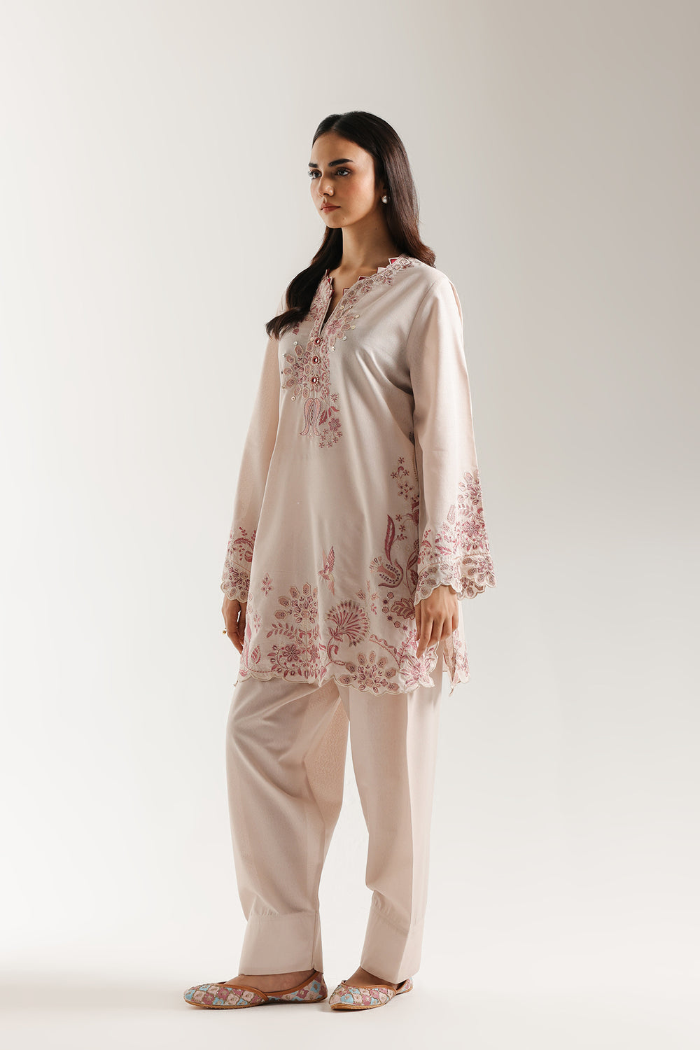 Unveil your soft, sophisticated side with this dreamy blush embroidered suit. The short, A line kurta is crafted from cotton viscose fabric and features delicate pink embroidery in stylized floral and bird motifs that gracefully adorn the neckline, hem, and cuffs of the wide, flowing sleeves. The neckline is elegantly finished with white stitch detailing. The ensemble is perfectly matched with relaxed wide leg shalwar in the same gentle hue, creating a harmonious and utterly refined traditional look.