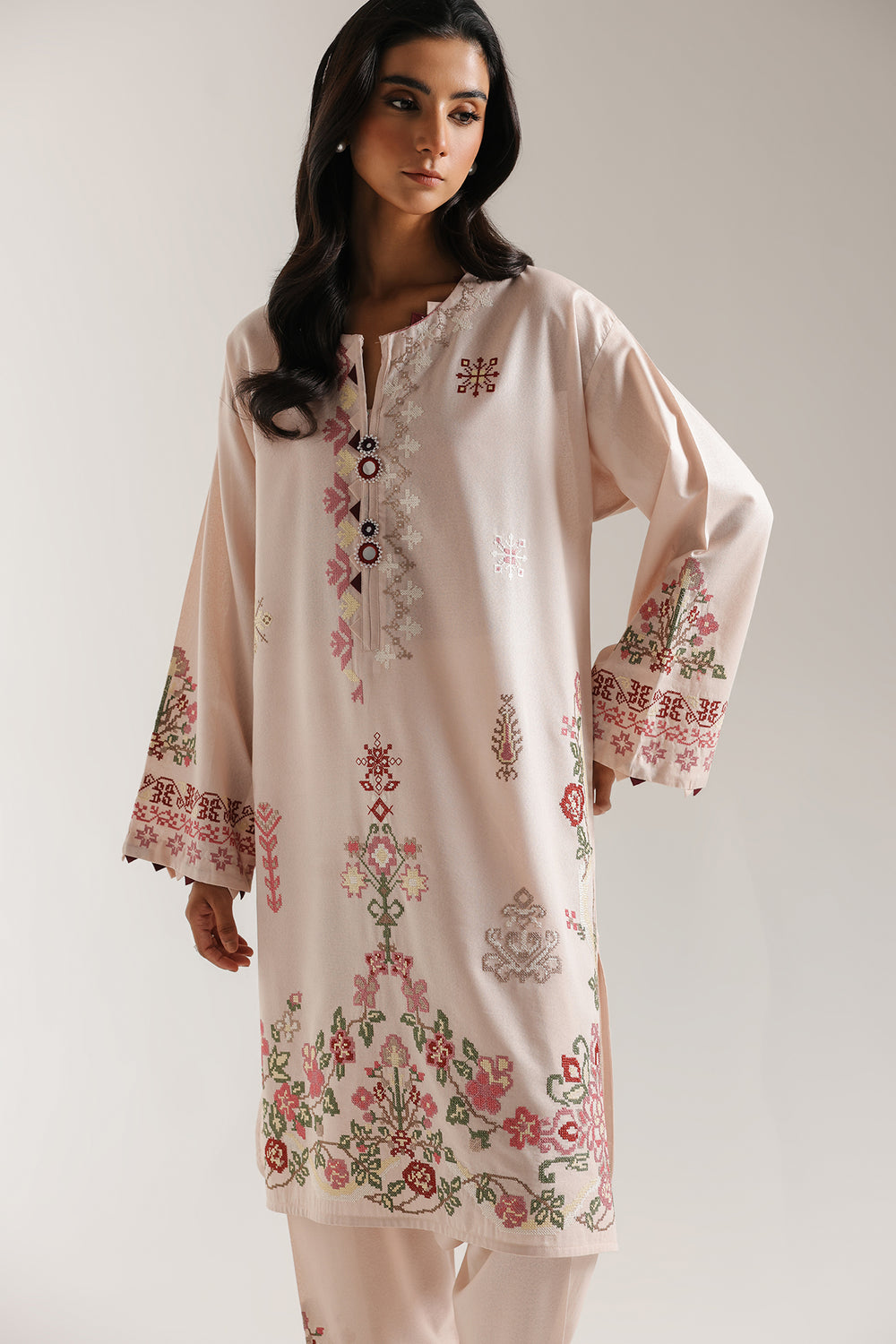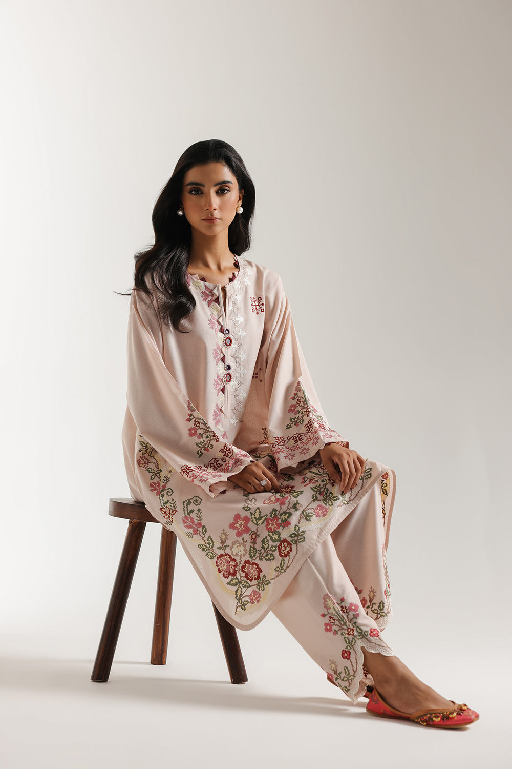 Wrap yourself in soft romance with this beautiful light pink embroidered suit. This serene ensemble features a regular shirt and matching shalwar in a delicate blush pink fabric. The shirt is beautifully adorned with delicate floral embroidery in soft pinks, reds, and greens, detailing the neckline, flowing down the center front, and bordering the hemline. It features a flattering slit neckline, and the wide sleeves are accented with complementary embroidered cuffs. The coordinating shalwar carry a delicate embroidered floral motif and scalloped edge at the hem. This suit is a stunning portrait of soft colors and exquisite artistry.
