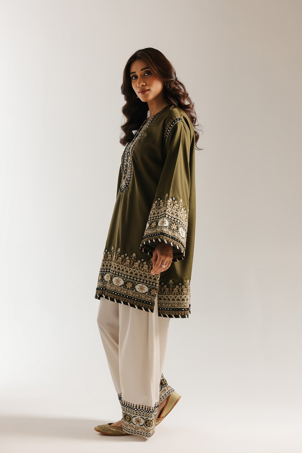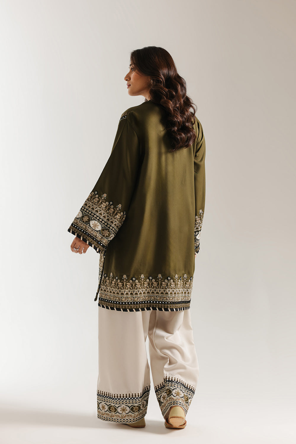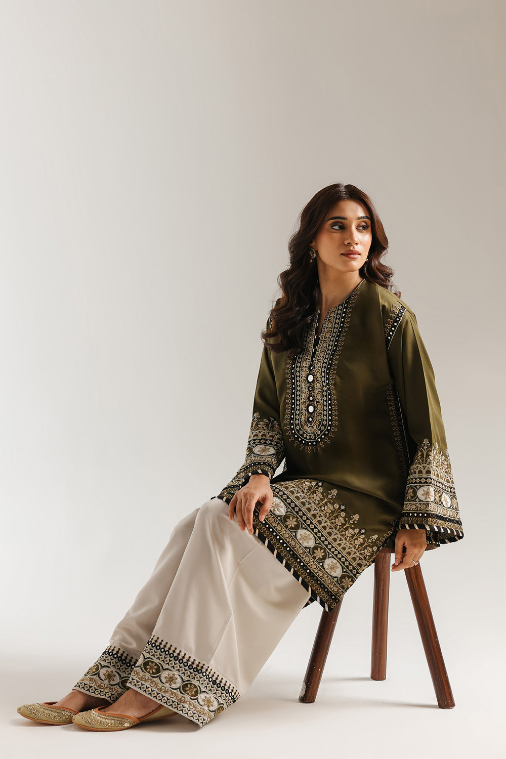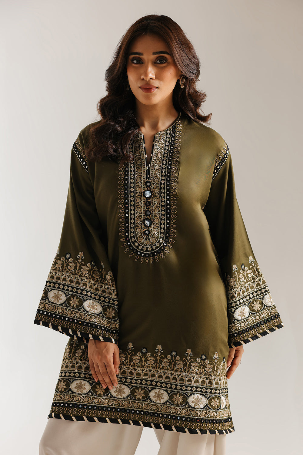 This exquisite embroidered suit showcases traditional craftsmanship with a contemporary silhouette. The olive-green kameez features elaborate black, gold, and cream embroidery adorning the neckline, cuffs, and hemline, while gracefully flared sleeves add movement and elegance. Paired with cream palazzo trousers embellished with coordinating embroidery at the hem, this ensemble balances rich detailing with refined proportions. Perfect for formal occasions, celebrations, or anyone seeking sophisticated ethnic wear that honors timeless design principles while maintaining modern wearability.