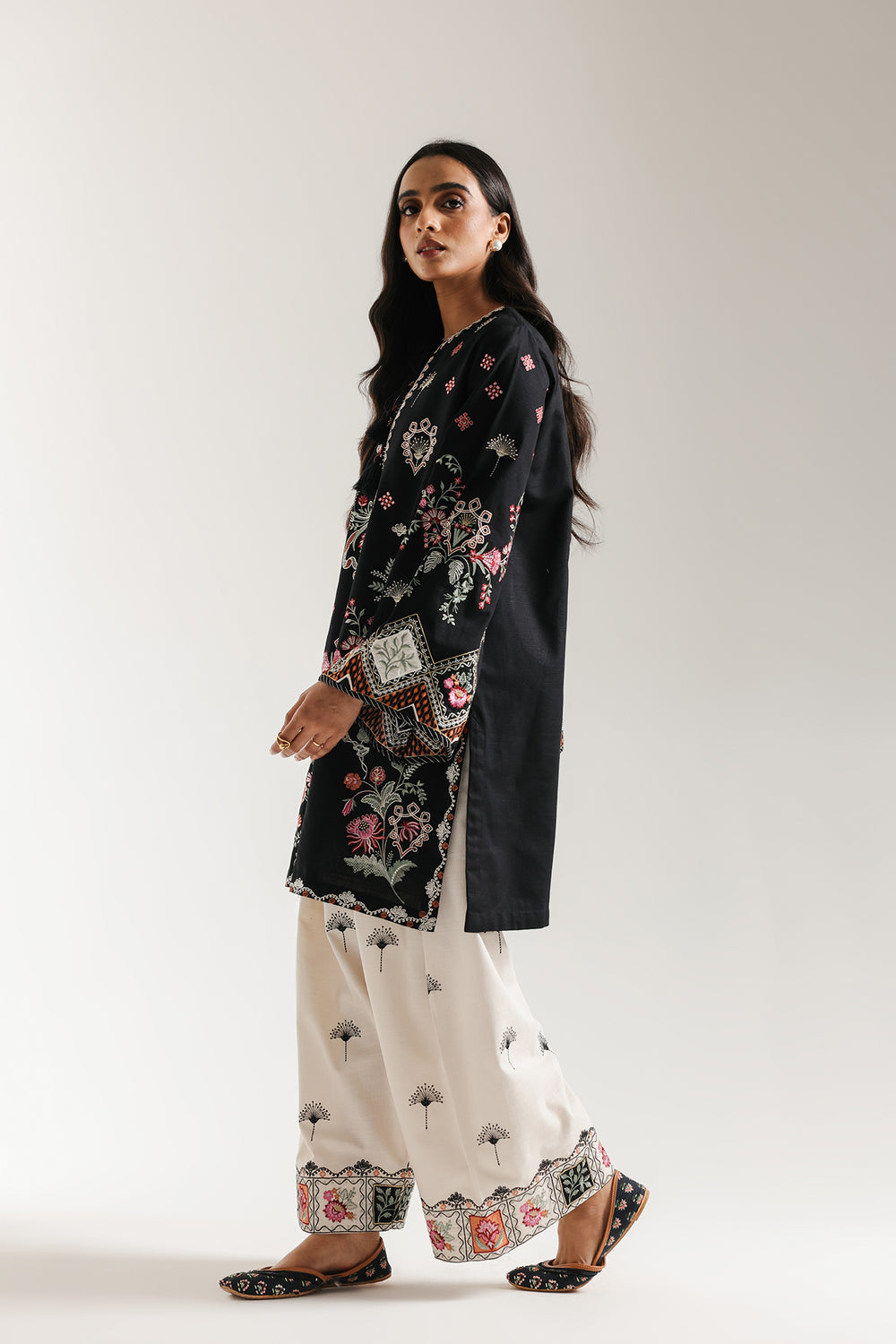 Exude vibrant sophistication in the rich contrast of this stunning embroidered suit. This striking ensemble features a short-length kurti and wide-leg shalwar in a deep solid black fabric. The shirt is dramatically embellished with intricate floral embroidery in beautiful pink, peach, and green hues, creating an ornate central panel and a heavy border around the hemline. It features a round neckline with a slit and a short placket accented by decorative buttons. The trousers offer a beautiful contrast, crafted from a pale beige fabric with scattered black floral embroidery, finished with a heavy, colorful embroidered border at the cuffs. This suit is a celebration of luxurious texture and bold, beautifully applied color.