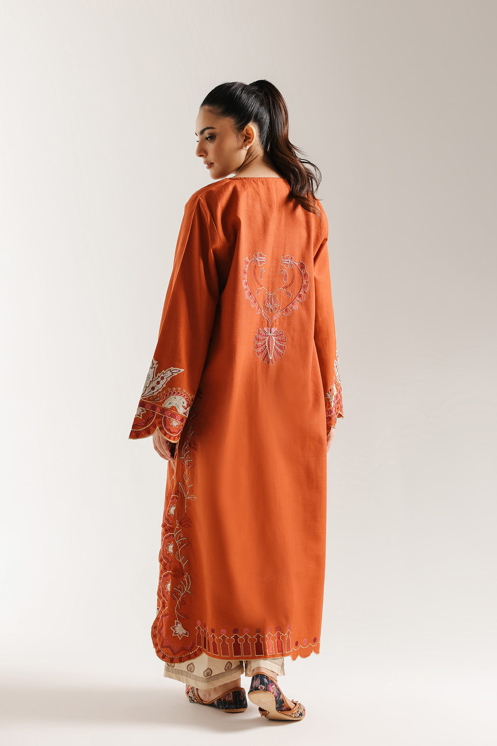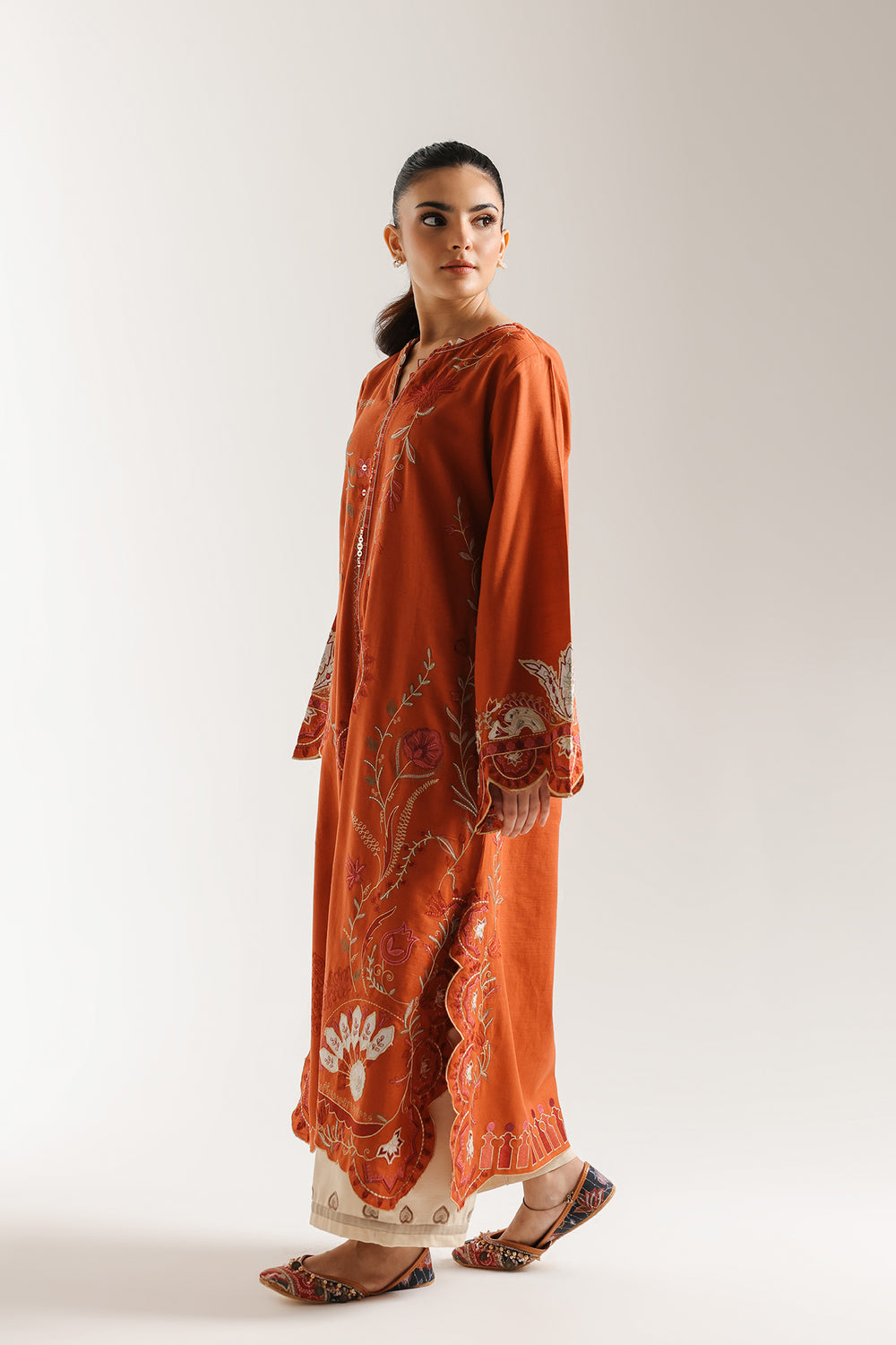 Drape yourself in the fiery hues of this captivating orange embroidered suit. This long, A line-cut shirt is made from a warm, rusty orange fabric and features an exquisite display of tone-on-tone thread embroidery. The intricate work covers the front panels, sleeves, and hem with detailed floral, vine, and scalloped patterns, creating rich texture and visual interest. The suit is beautifully contrasted with a pair of light beige trousers that feature a coordinating embroidered motif at the hem. This elegant and vibrant ensemble is a perfect choice for making a statement at any festive or formal event.