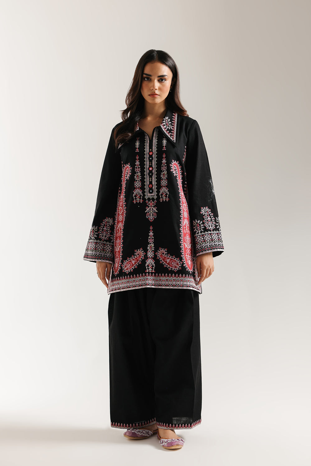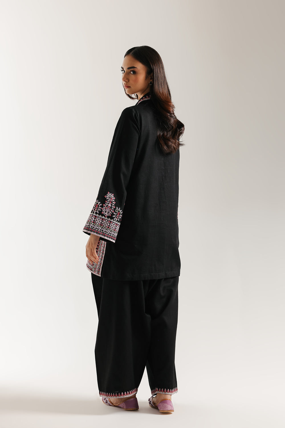 Make a powerful, artistic statement with this elaborate black embroidered suit. The A line-cut kurta is richly adorned with striking floral and geometric embroidery in shades of red, pink, and white across the front, yoke, and wide, cuff-detailed sleeves. The contrasting embroidery creates a visually stunning, ornate border effect. The ensemble is elegantly completed with matching black culotte trouser that feature a complementary embroidered motif at the hem, resulting in a cohesive and memorable traditional look.