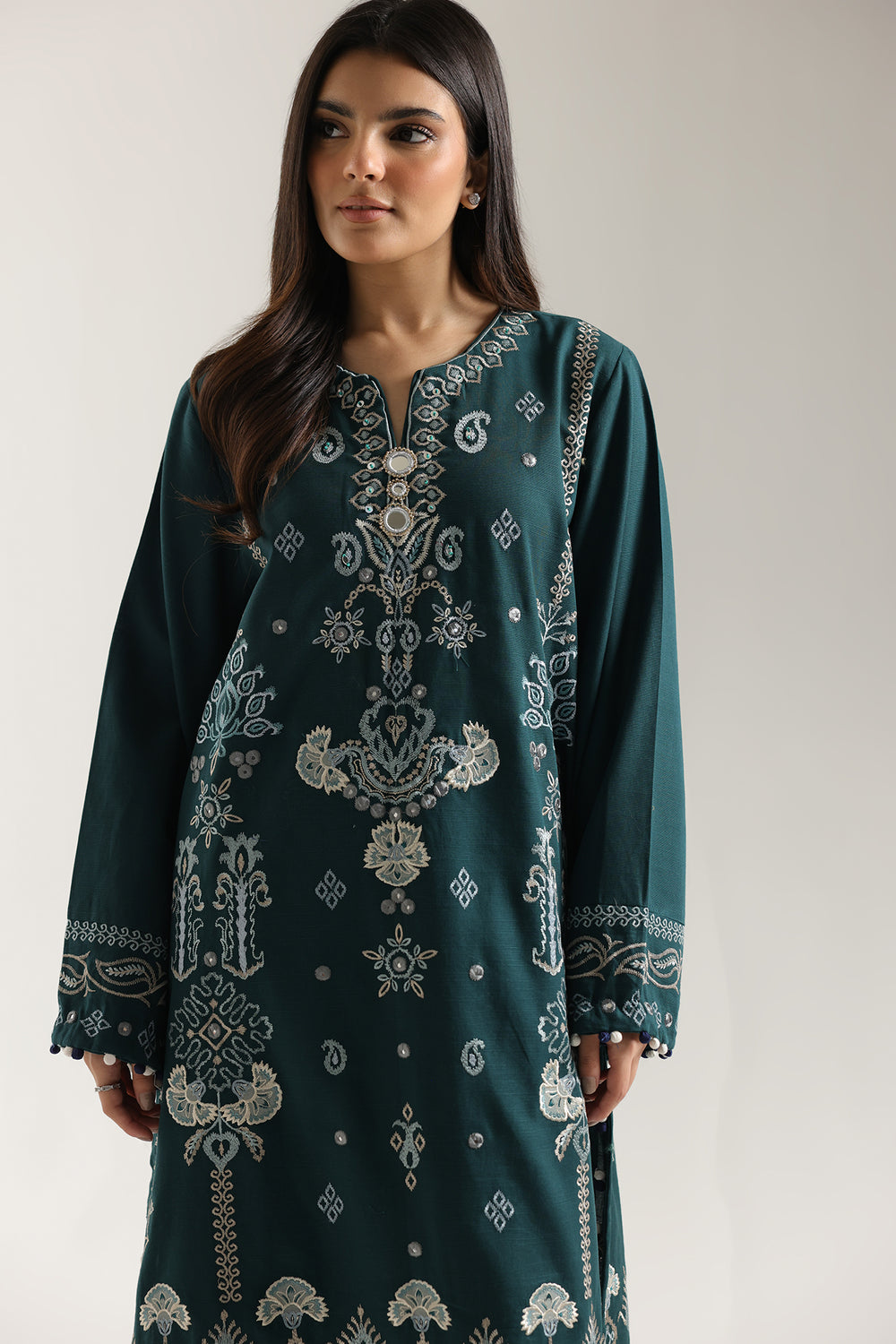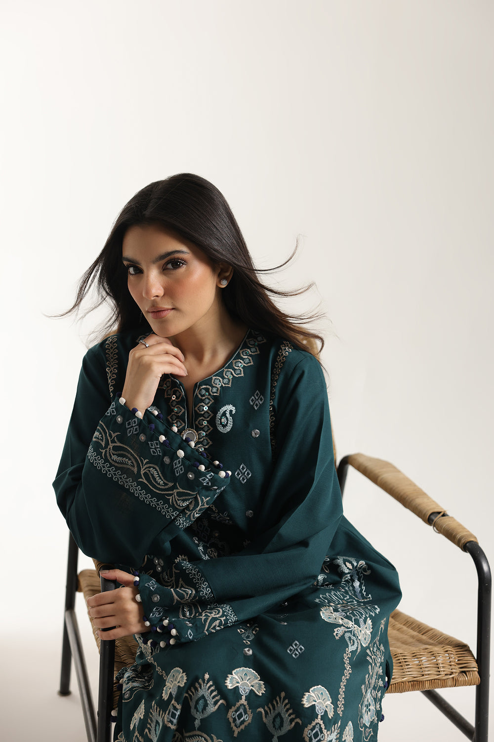 Dive into the rich depths of this embroidered suit. The long, A-line-cut kurta is a masterpiece of symmetrical design, featuring exquisite thread and cutwork embroidery in contrasting white and light blue. The embroidery forms striking columns of detailed floral and traditional motifs down the front panel. The V neckline, wide sleeves, and hem are all finished with delicate scalloped cutwork edges, adding an extra layer of artistry and dimension. The ensemble is perfectly completed by coordinating trouser that feature matching intricate embroidered and cutwork borders at the hem, ensuring a cohesive and sophisticated traditional look.