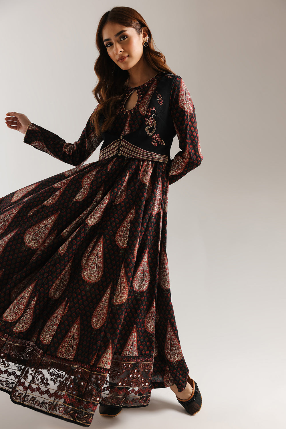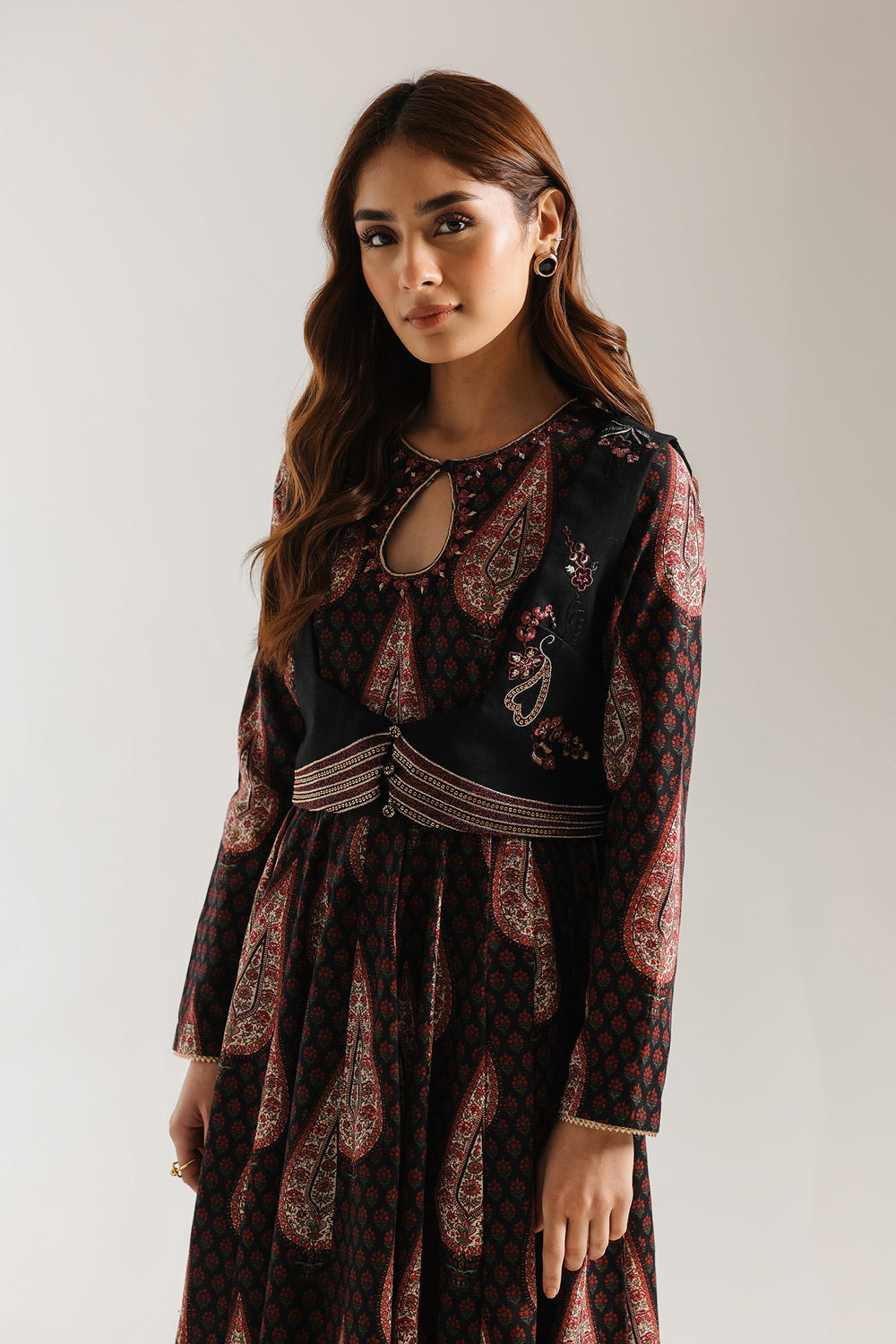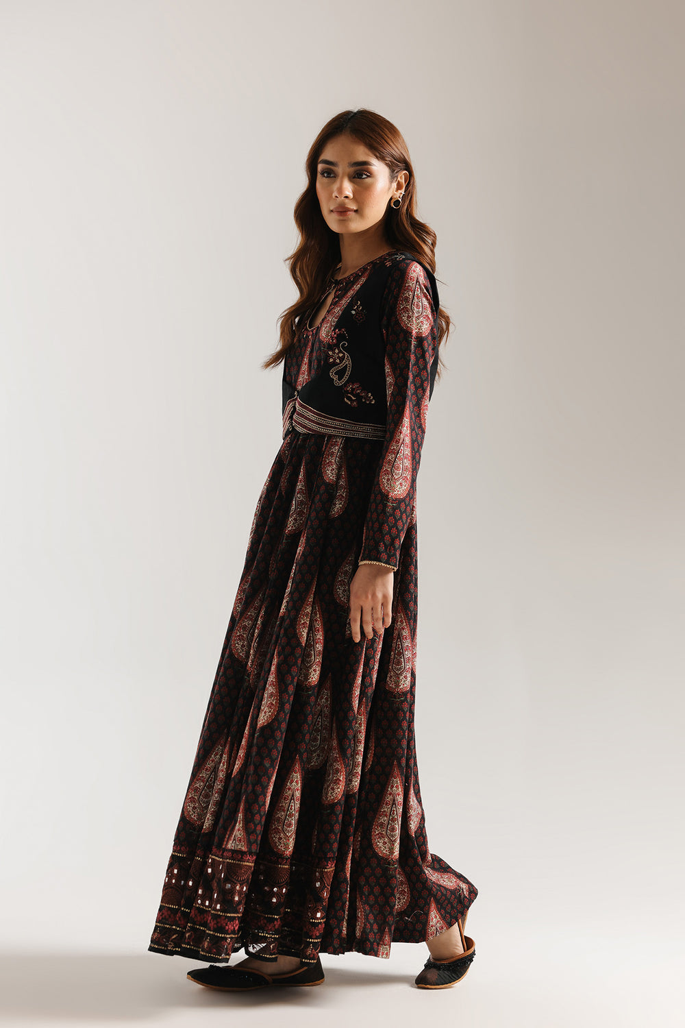 This striking black ensemble is a true celebration of masterful embroidery craftsmanship. Adorned with an all-over ornate floral paisley design and intricately coordinated sleeve detailing, the full-length silhouette drapes with understated elegance to create a refined and graceful look. Delicate embroidery along the hemline completes the composition with a polished finish. Paired with a statement black waistcoat, richly embroidered in gold and red accents, the ensemble exudes regal charm and sophistication. Ideal for formal occasions, evening events, and festive celebrations, this look blends timeless tradition with elevated elegance.