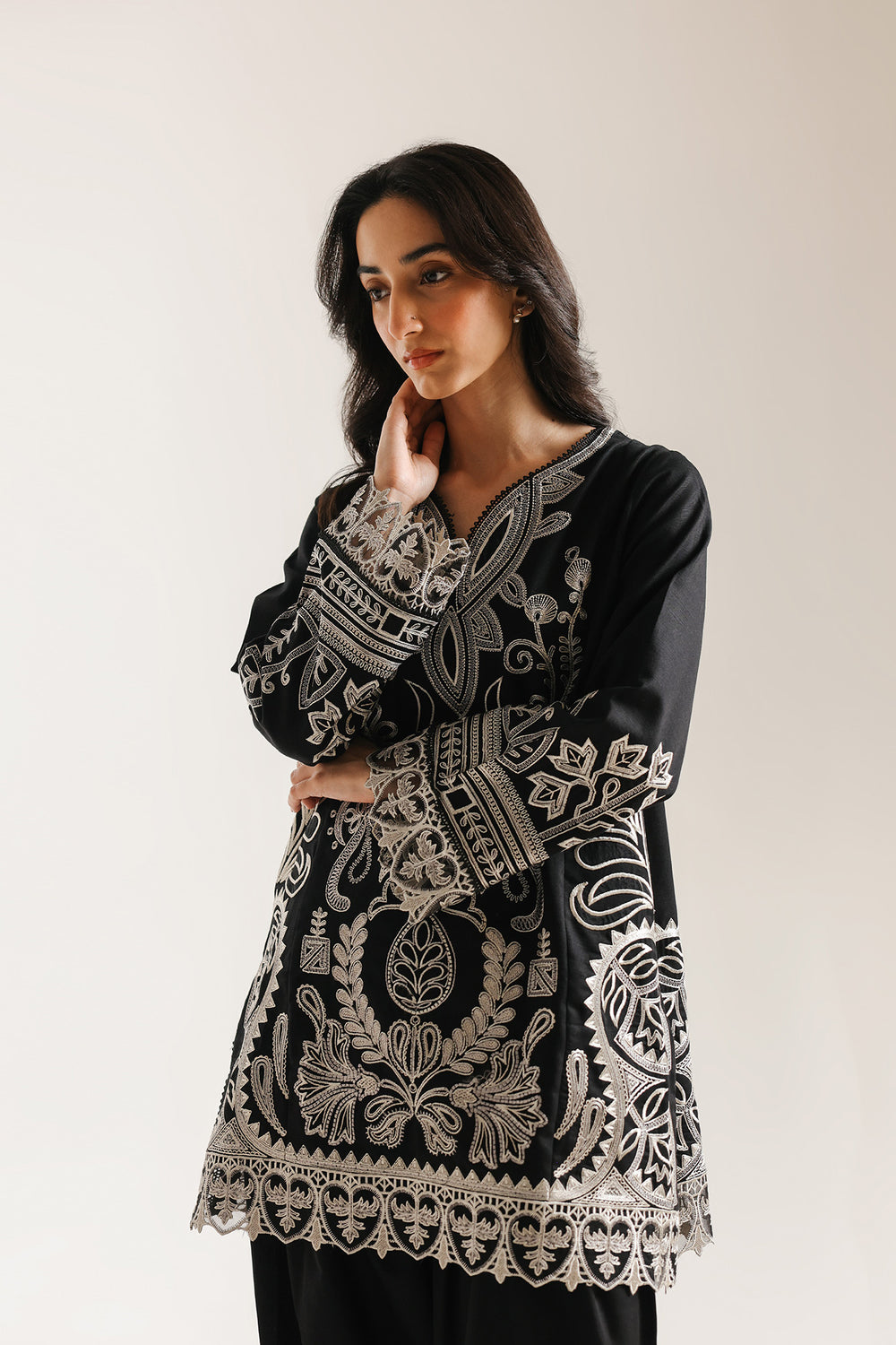 This exquisite embroidered suit commands attention with its opulent white and silver threadwork rendered in intricate Baroque and Paisley-inspired motifs. The straight-cut kurta showcases a densely embroidered central panel that flows across the shoulders and cascades down the sleeves, while ornate borders frame the hemline and cuffs with meticulous detail. A refined V-neck with flat collar completes the neckline. The ensemble is paired with wide-legged black trousers featuring a striking contrasting embroidered hem.