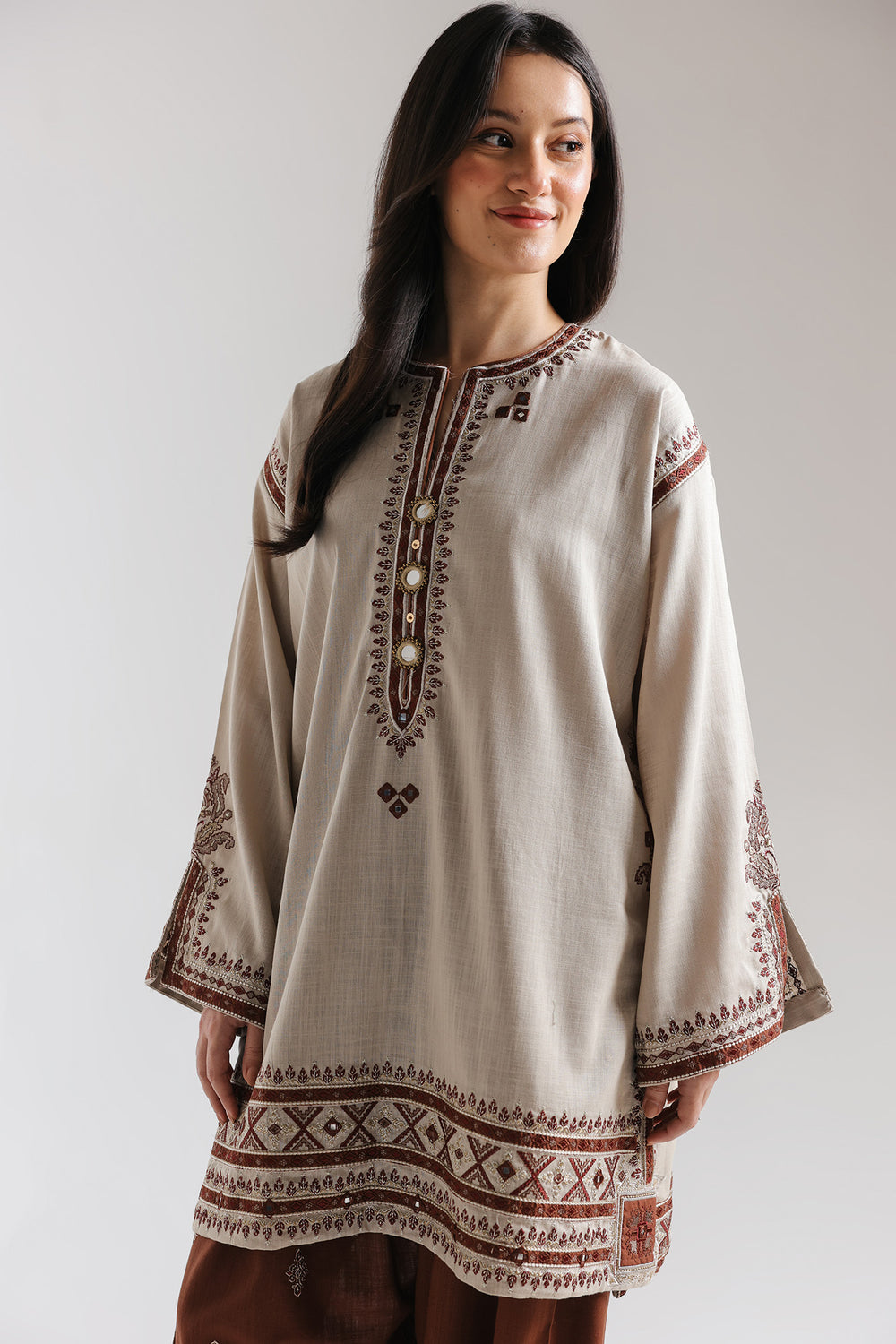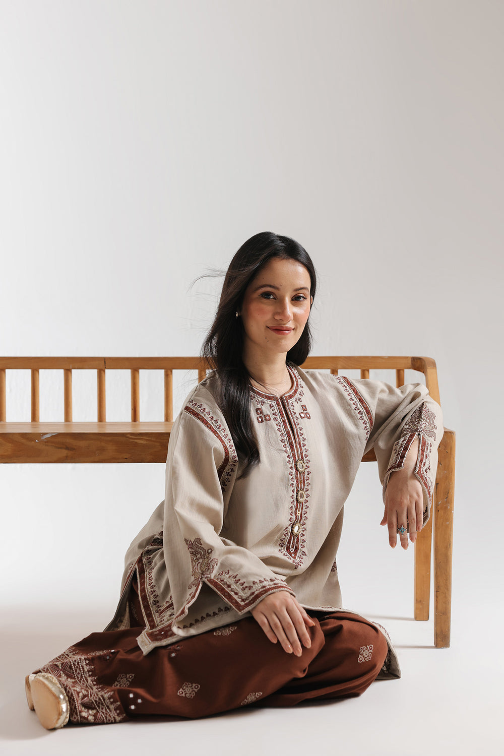 Enhance your formal wardrobe with our embroidered suit. Featuring intricate embroidery on the shirt and borders, paired with wide-leg shalwar and long bell sleeves, this elegant suit is perfect for any formal occasion. Elevate your style and make a statement with this beautifully crafted ensemble.