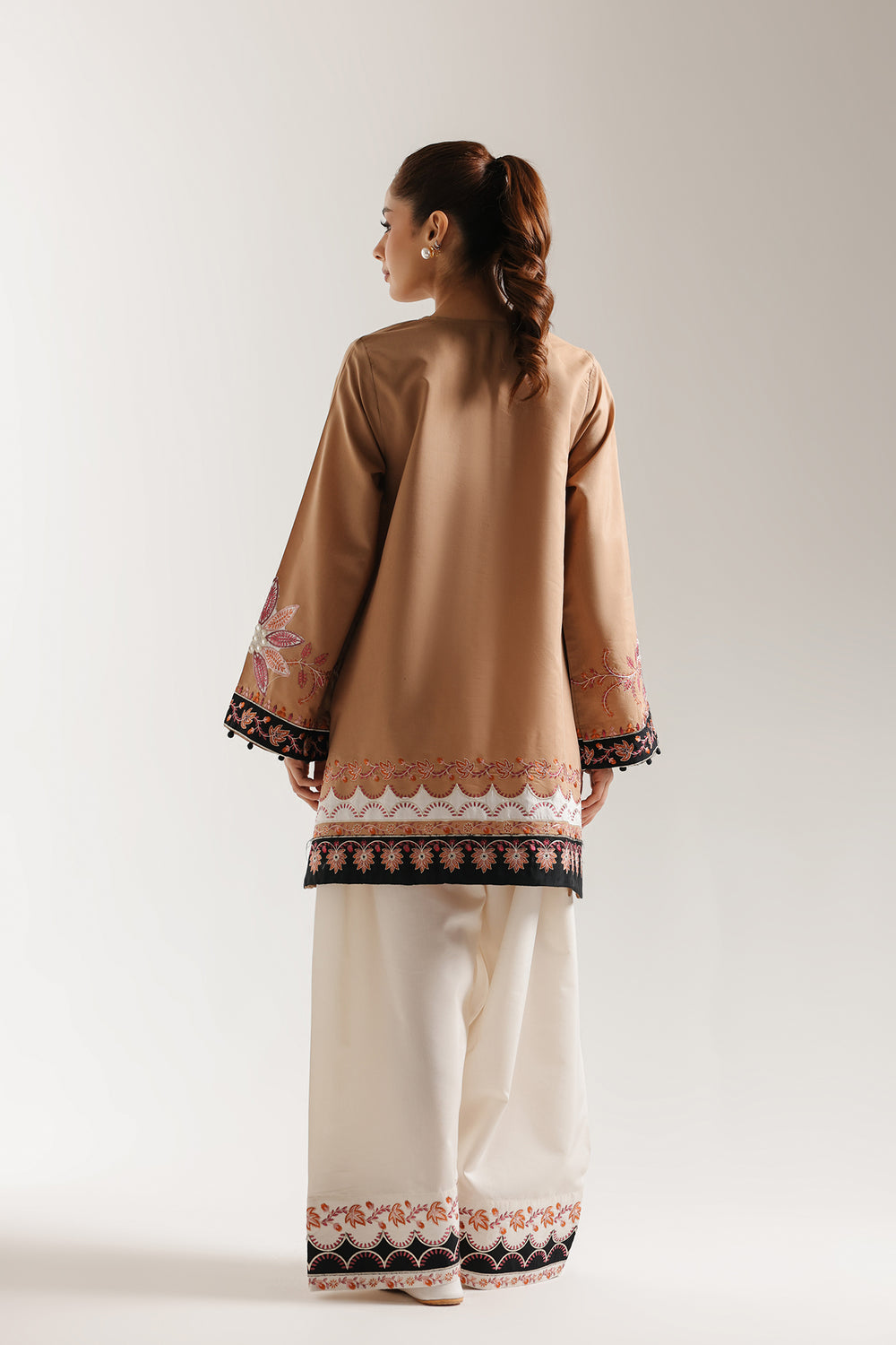 Elevate your wardrobe with this sophisticated embroidered suit featuring a caramel-toned short shirt paired with pristine white shalwar. The intricate embroidery detailing on the shirt showcases refined craftsmanship, creating a striking contrast against the neutral palette. Perfect for formal occasions, cultural celebrations, or elevated everyday wear, this ensemble combines traditional elegance with contemporary styling. The structured fit of the short shirt flatters various body types, while the flowing white shalwar ensures comfort and grace. An ideal choice for those seeking timeless sophistication with artistic detail.