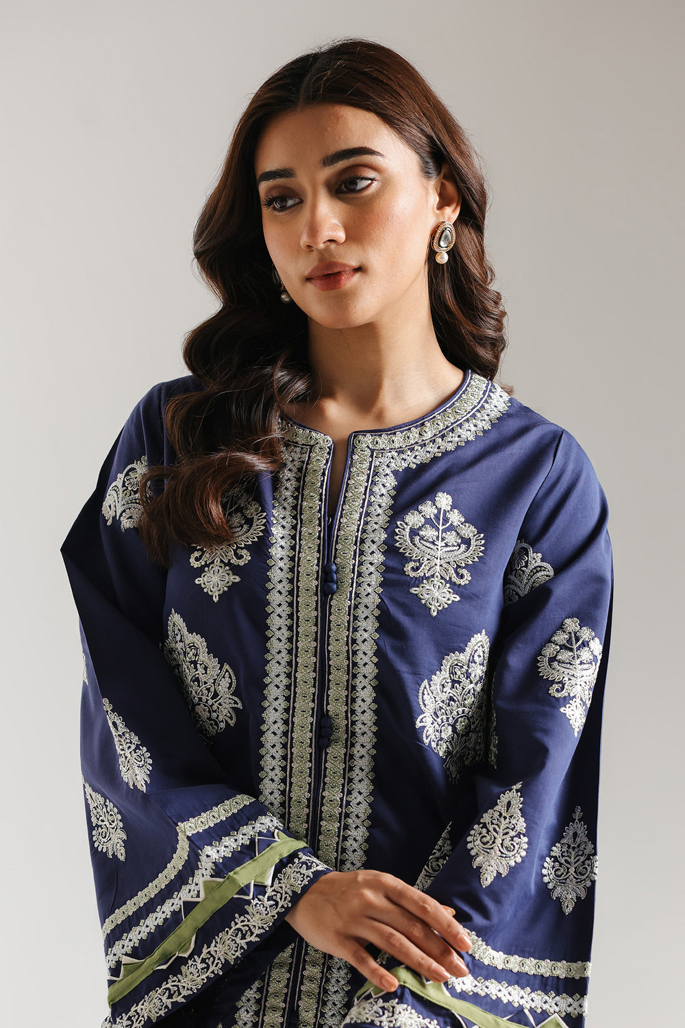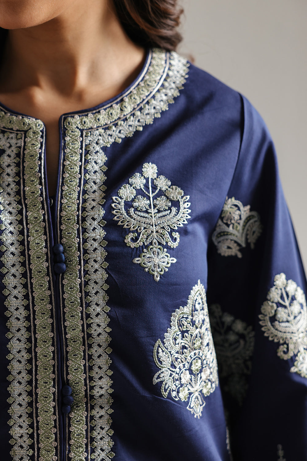 Make a regal and artisanal statement with this indigo-blue suit, featuring a regular length shirt and coordinated white trousers. The shirt is designed with a round neckline and a central buttoned placket, framed by a wide, vertical band of intricate ivory embroidery. Symmetrical botanical medallions and delicate floral sprays are scattered across the front and wide sleeves, while the side vents and hemline feature a dramatic, laser-cut scalloped border with dense needlework. This ensemble is paired with crisp white trousers that showcase a striking red-and-white embroidered border along the cuffs, offering a sophisticated contrast of colors and textures.