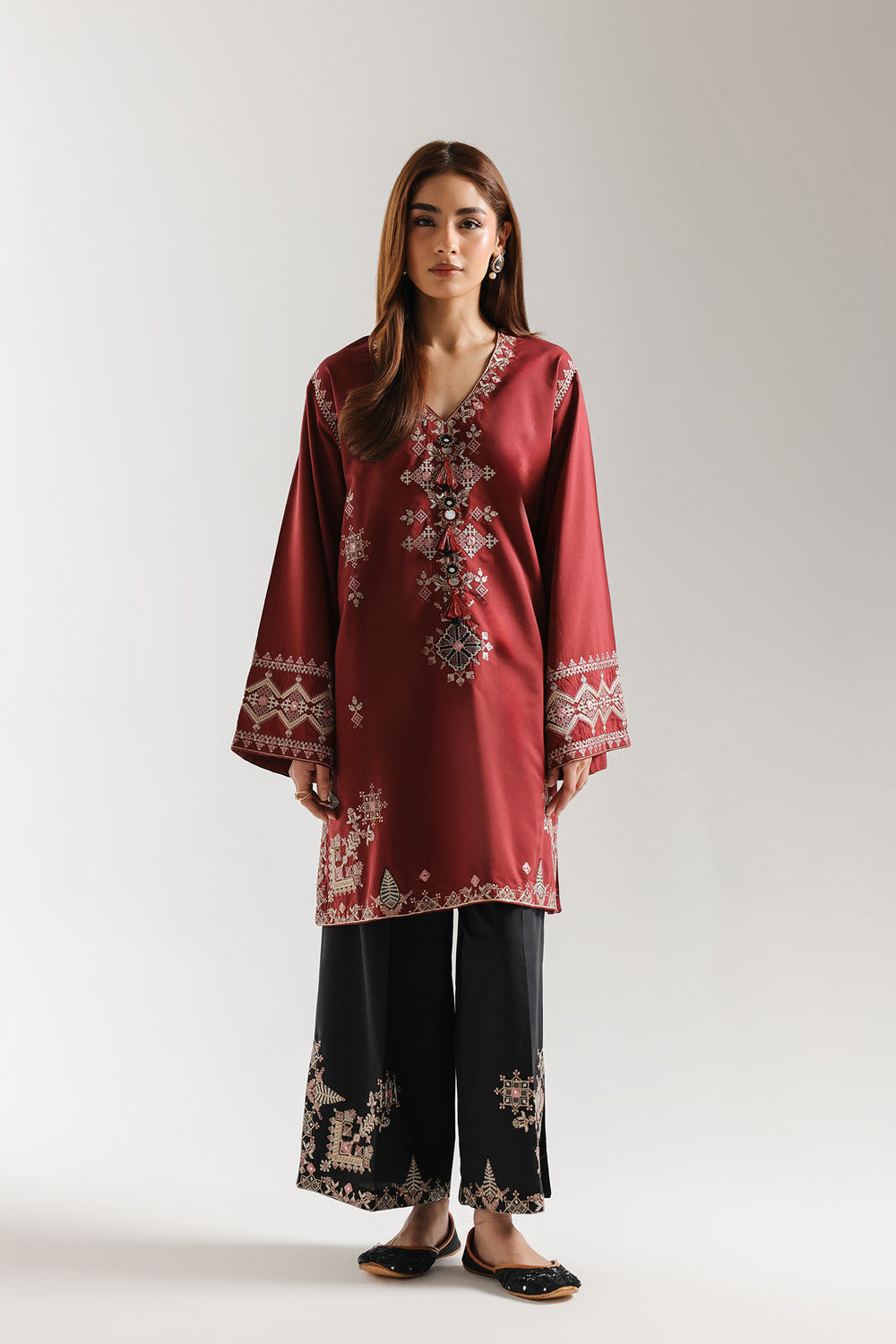 Define elegance with this sophisticated maroon and black embroidered suit. This striking two-piece ensemble features a long-sleeved shirt in a deep, rich maroon shade that exudes a sense of regal charm. The shirt is beautifully detailed with intricate embroidery that elegantly traces the V-neckline and adorns the wide sleeve cuffs and hem. Delicate floral and geometric motifs are artfully scattered across the fabric, adding a layer of fine craftsmanship to the relaxed silhouette. Complementing the top are black wide-leg trousers, which feature bold, coordinating embroidery at the base, creating a balanced and high-contrast look. Perfectly suited for formal gatherings or festive celebrations, this suit offers a timeless blend of traditional motifs and contemporary style.