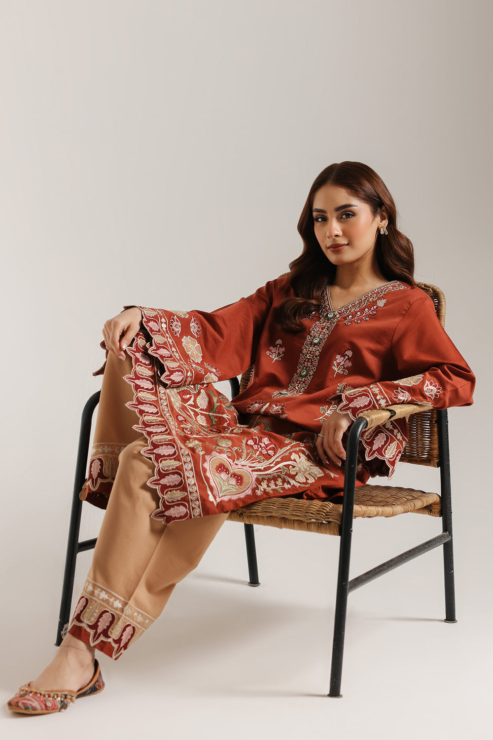Crafted with meticulous attention to detail, this embroidered suit exemplifies refined artisanal craftsmanship. The bright red shirt showcases intricate floral and botanical embroidery in ivory, pink, and green, with patterns flowing elegantly across the front and voluminous sleeves. A delicate scalloped hem adds sophisticated finishing touches. Paired with a coordinating shalwar featuring an ornate embroidered border on a contrasted mustard shalwar, this cohesive ensemble delivers understated luxury. Ideal for significant celebrations and formal occasions, the suit demonstrates the hallmark quality and design excellence that distinguishes classy wear.