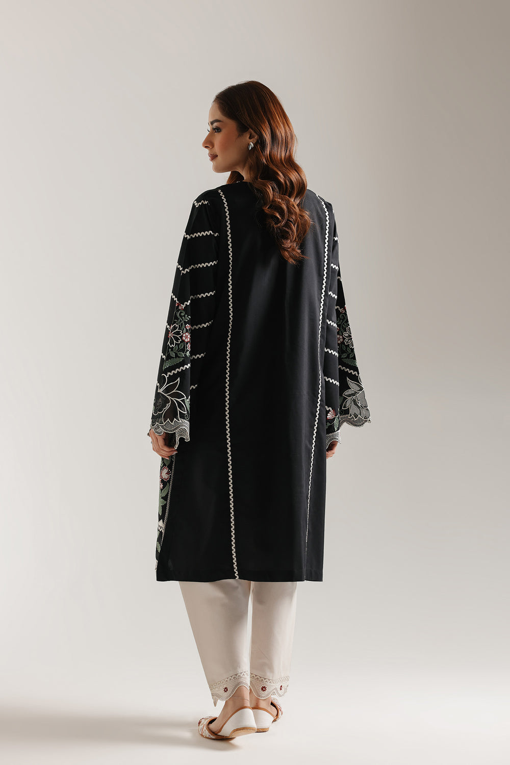 This exquisite embroidered suit pairs a black kurta with refined white and pink embroidery detailing throughout. The accompanying white shalwar features elegant scalloped edges that add a graceful finishing touch. Crafted with meticulous attention to detail, this ensemble combines traditional artistry with contemporary silhouettes, making it perfect for weddings, festive gatherings, or formal events. The harmonious interplay of black, white, and pink creates a balanced aesthetic that flatters while maintaining an air of sophisticated elegance and cultural refinement.