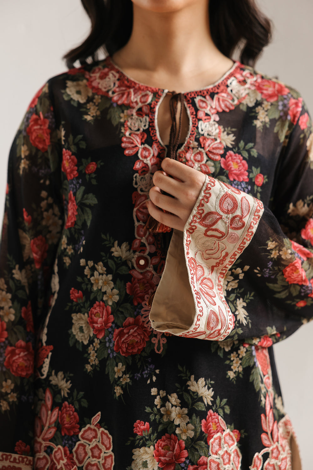 This sophisticated two-piece embroidered suit for women showcases a dramatic black and red floral theme, offering a bold yet timeless aesthetic. The long-sleeved tunic features a rich, all-over print of red roses and green foliage, beautifully accented by an intricate embroidered border along the hemline and sleeve cuffs. A traditional tassel-tie embroidered neckline adds a charming artisanal detail, while the relaxed silhouette ensures an elegant drape. The ensemble is perfectly balanced with solid black wide leg shalwar, which feature a stunning and highly detailed cream and red embroidered border at the ankles. This cohesive design mirrors the craftsmanship of the tunic, making it an ideal choice for evening festivities, formal gatherings, or special family events. Combining premium fabric with detailed needlework, this suit provides both luxury and comfort for the contemporary wardrobe.