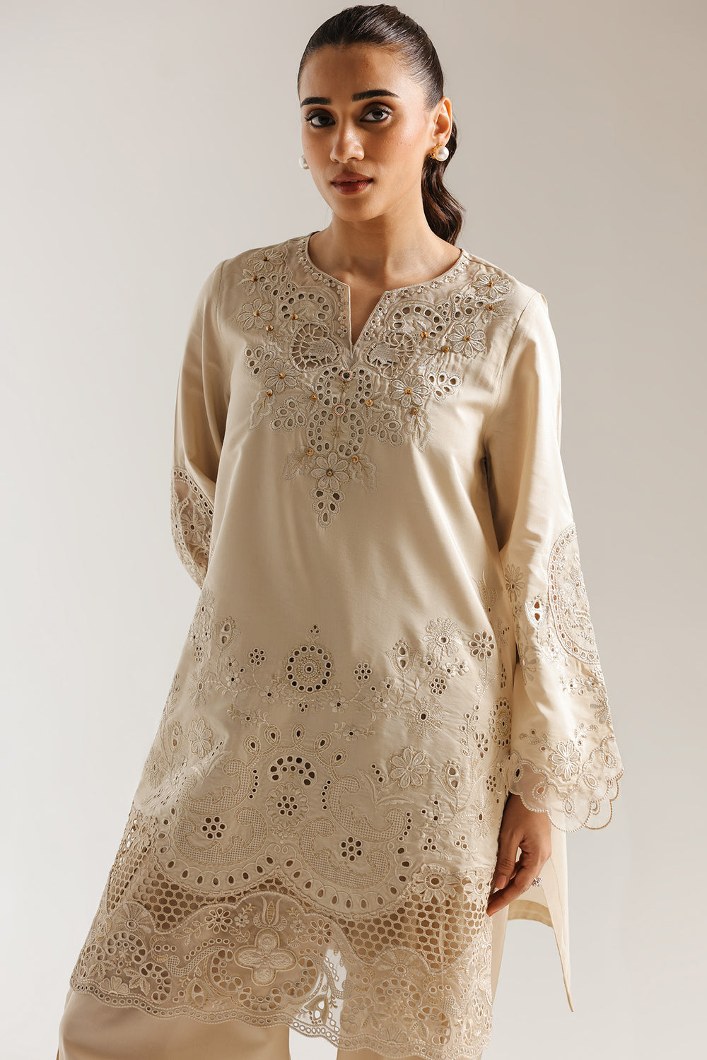 Indulge in the sheer sophistication of this monochrome masterpiece, rendered in a creamy vanilla tone that epitomizes understated luxury. The shirt is a triumph of delicate craftsmanship, featuring a split round neckline adorned with dense floral embroidery and subtle golden beadwork that adds a hint of celestial shimmer. Its most captivating feature is the extensive use of intricate eyelet lace and cutwork, which flows across the lower bodice and culminates in a dramatic, sheer-effect hemline with scalloped edges. This architectural detailing is mirrored on the statement bell sleeves, where ornate floral embroidery meets breathable cutwork panels for a look that is both airy and regal. Paired with relaxed-fit, wide-leg shalwar in a matching hue, this ensemble offers a clean, elongated silhouette perfect for high-profile daytime events or serene festive celebrations.