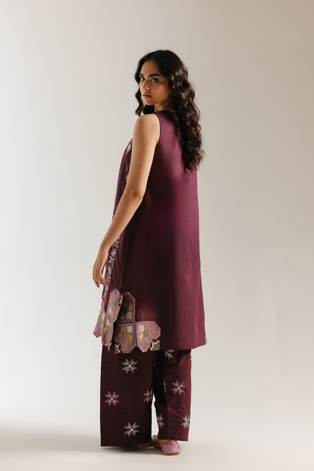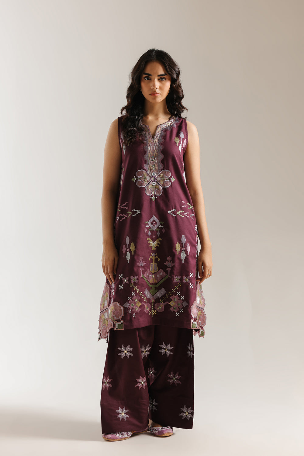Make a regal and contemporary statement with this grape-colored two-piece suit, featuring a sleeveless longline shirt and matching wide-leg shalwar trousers. The shirt is designed with a split V-neckline and showcases a symphony of geometric and pixelated embroidery in soft lavender, sage green, and ochre tones that cascade down the front and adorn the hemline. This artistic craftsmanship is mirrored in the coordinated trousers, which feature scattered embroidered star motifs and a relaxed silhouette for effortless movement. Finished with a delicate laser-cut scalloped border along the shirt's hem, this ensemble offers a perfect blend of modern digital-inspired artistry and traditional grace.