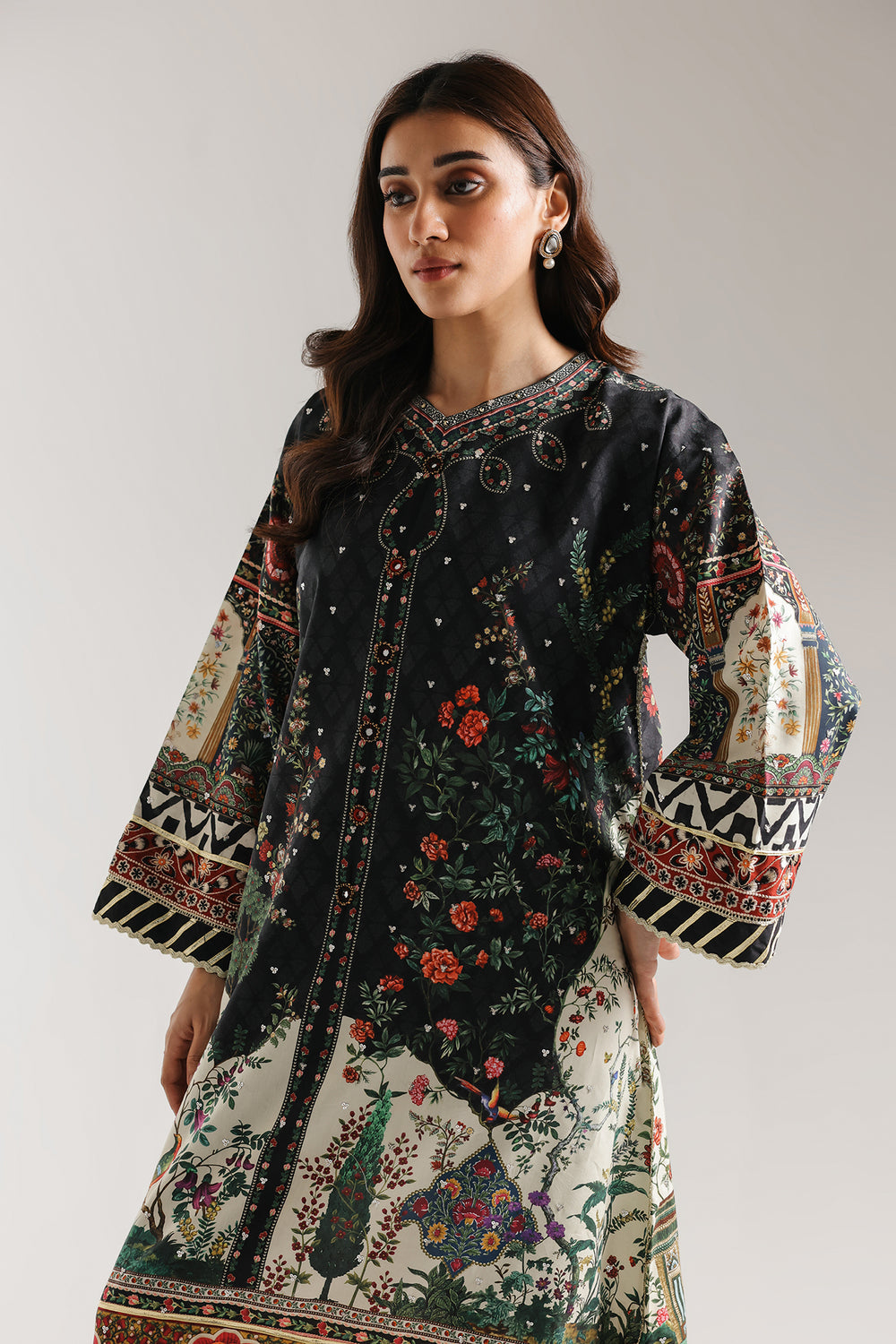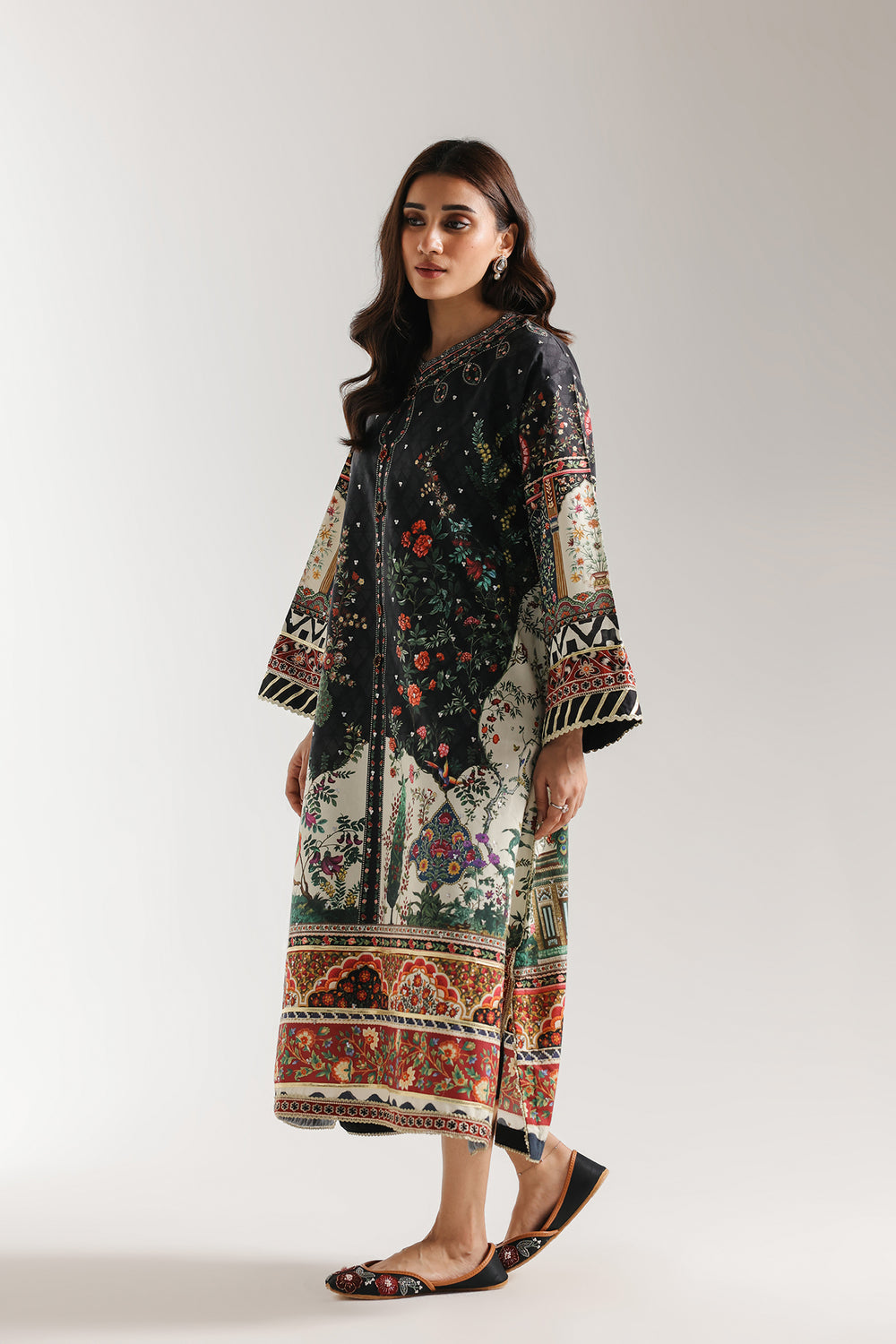 Make a dramatic and artistic statement with this jet-black longline kaftan, featuring an A-line silhouette and a vibrant, multi-layered digital print. The design is characterized by a high round neckline and a central buttoned placket, showcasing a picturesque landscape of lush gardens, architectural elements, and exotic birds in rich shades of emerald green, ruby red, and ochre. This intricate scene transitions from a dark, floral-scattered upper half into a bright ivory lower panel, all framed by dense geometric and floral borders along the wide sleeves and hemline. With its floor-length drape and storytelling print, this piece offers a perfect blend of modern sophistication and classic Eastern aesthetics.