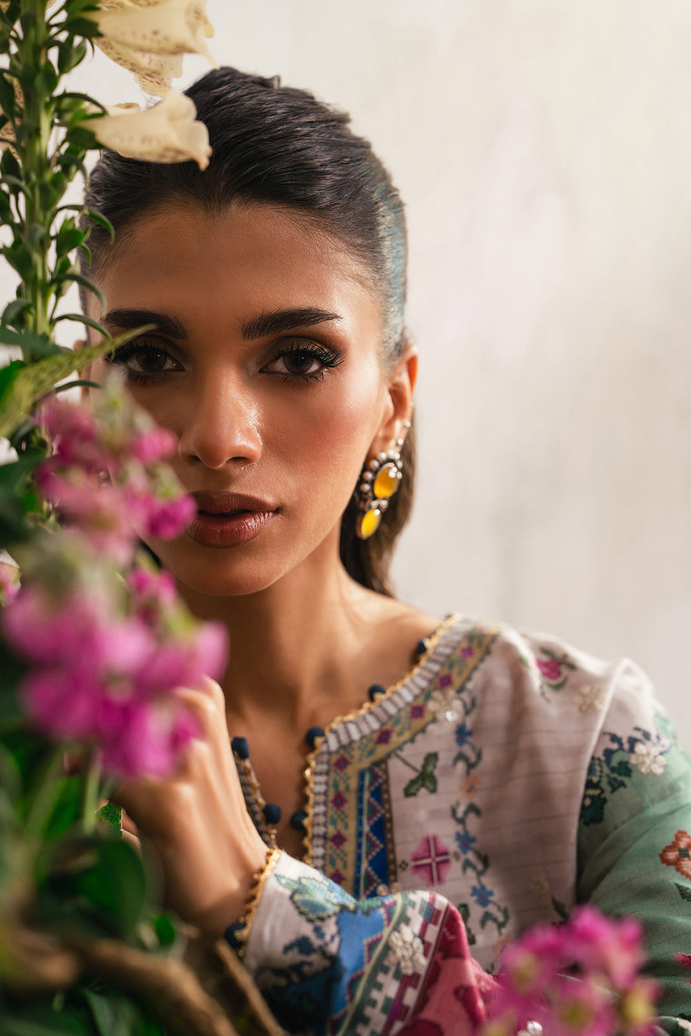 Radiate heritage-inspired charm in this stone-grey embroidered suit, where artisanal texture meets a rich, autumnal palette. The long-line tunic features a sophisticated split neckline and is adorned with overall scattered embroidery. Complemented by tapered fit, scalloped shalwar that mirror the tunic's refined craftsmanship, this ensemble is an exquisite statement of traditional grace and modern luxury.