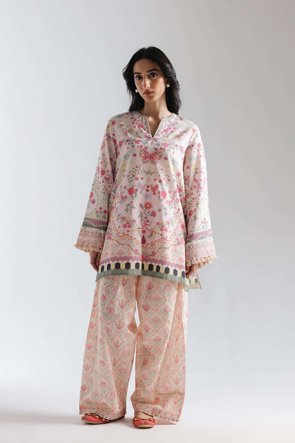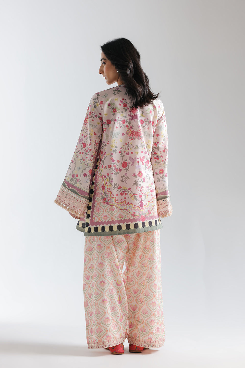 Infuse your festive wardrobe with the soft, romantic charm of this stunning two-piece ensemble, rendered in a delicate palette of blush pink and muted sage. The shirt features a clean split V-neckline and is adorned with a whimsical all-over botanical print, featuring fluttering butterflies, soaring birds, and vibrant pink blossoms. The long sleeves are a highlight of the design, finished with intricate lace borders and playful fringe tassel detailing that adds a layer of bohemian texture. This artisanal aesthetic is grounded by a unique geometric hemline border in deep sage and mauve, providing a modern contrast to the ethereal floral theme. The look is beautifully completed with voluminous, wide-leg trousers featuring a repetitive tulip motif in matching pastel tones. Effortlessly elegant and full of movement, this suit is the perfect choice for garden parties or sophisticated daytime celebrations.