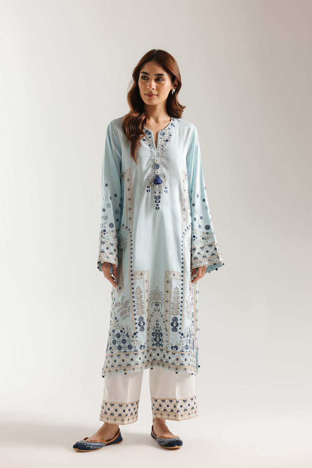 Embrace a look of serene sophistication with this stunning sky blue ensemble, a perfect blend of airy tones and intricate artisanal detail. The long-sleeved shirt is crafted from a soft, luminous fabric featuring a refined split neckline accented with a delicate blue tassel and ornate embroidery. A majestic central composition of silver and navy threadwork depicts trailing vines and botanical motifs, framed by vertical geometric borders that add a structured elegance to the flowing silhouette. The statement sleeves and hemline are the true highlights of the piece, showcasing dense floral embroidery and delicate pom-pom trim that creates a weighted, high-fashion finish. This ensemble is beautifully completed with crisp white trouser, which feature a coordinating embroidered border at the ankle to ensure a polished and cohesive look. Ideal for daytime festivities or elegant evening gatherings, this suit offers a refreshing and regal presence.