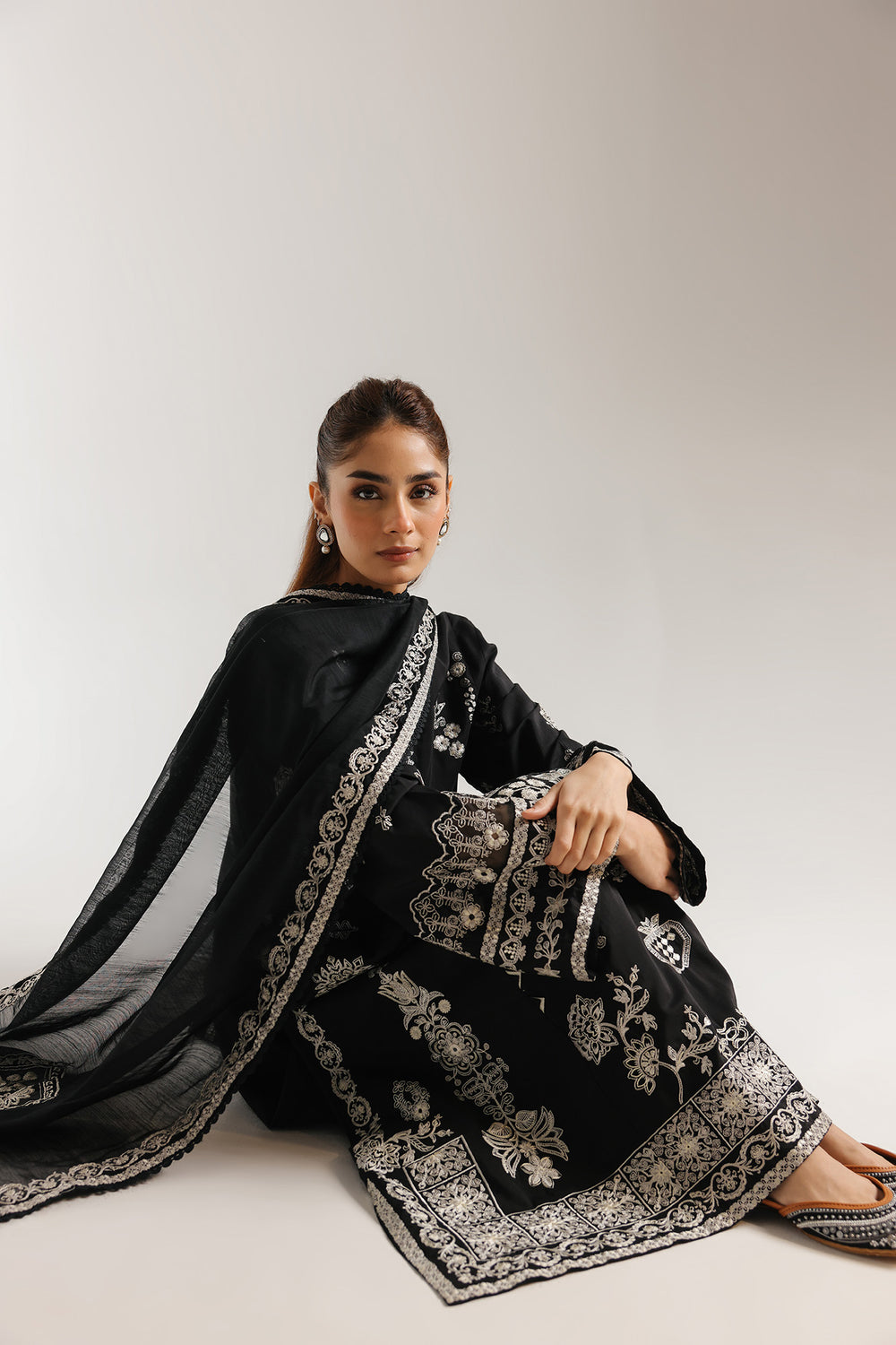 Experience the height of sophisticated contrast with this stunning three-piece ensemble, where deep midnight black provides a dramatic canvas for ivory artistry. The long shirt features a refined split neckline, framed by an intricate geometric border and delicate button detailing that flows into a collage of traditional embroidered motifs. Scattered floral frames and architectural patterns adorn the bodice, leading to a lavishly embroidered hemline that grounds the look with regal complexity. The silhouette is further elevated by a sheer, lightweight dupatta featuring a continuous floral vine border that echoes the shirt’s artisanal craftsmanship. Statement wide sleeves with layered embroidery and scalloped edges pair perfectly with matching black-and-white trouser, finished with a delicate lace-style trim at the ankles. Timeless and commanding, this suit is the premier choice for formal evening celebrations or high-style festive gatherings.