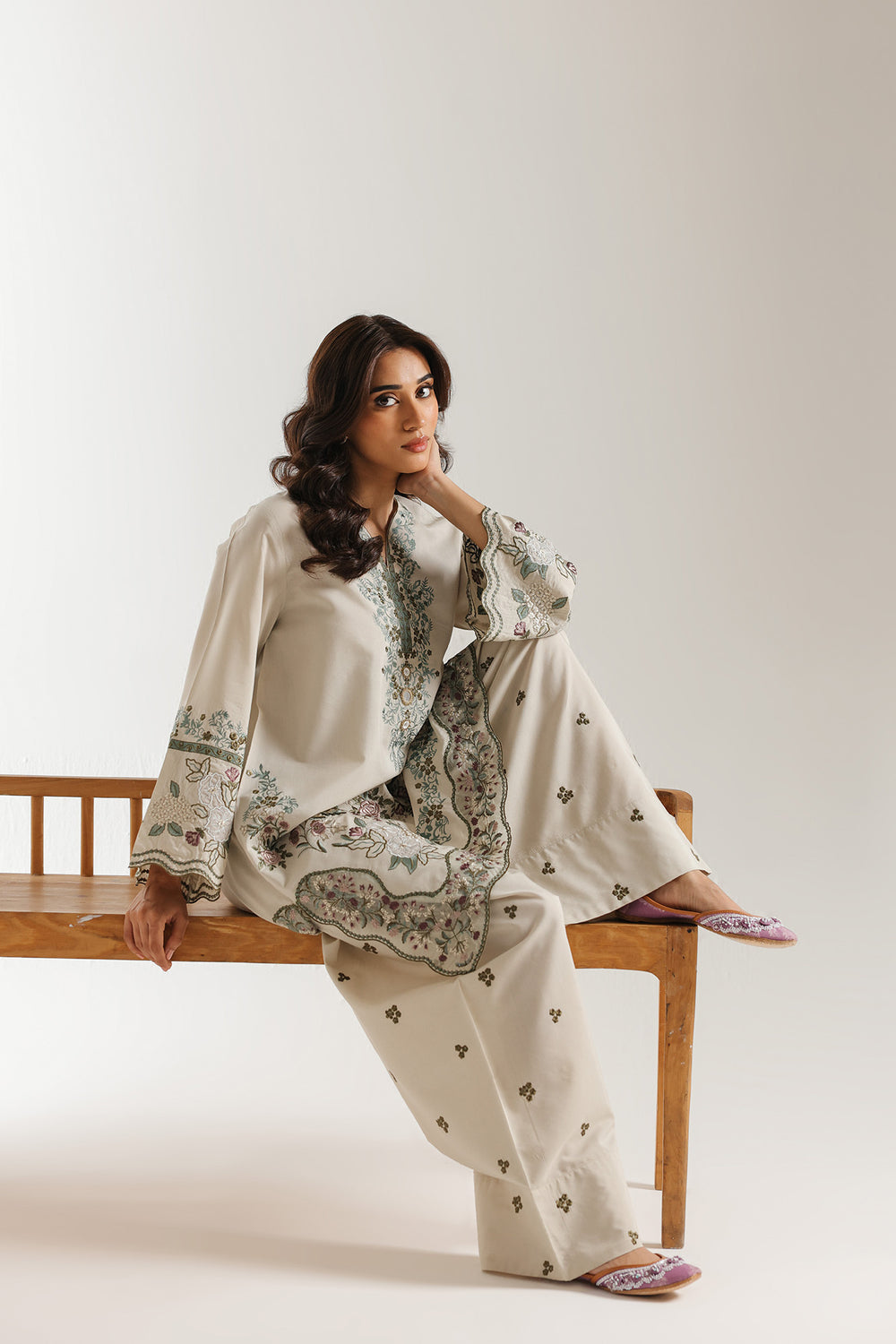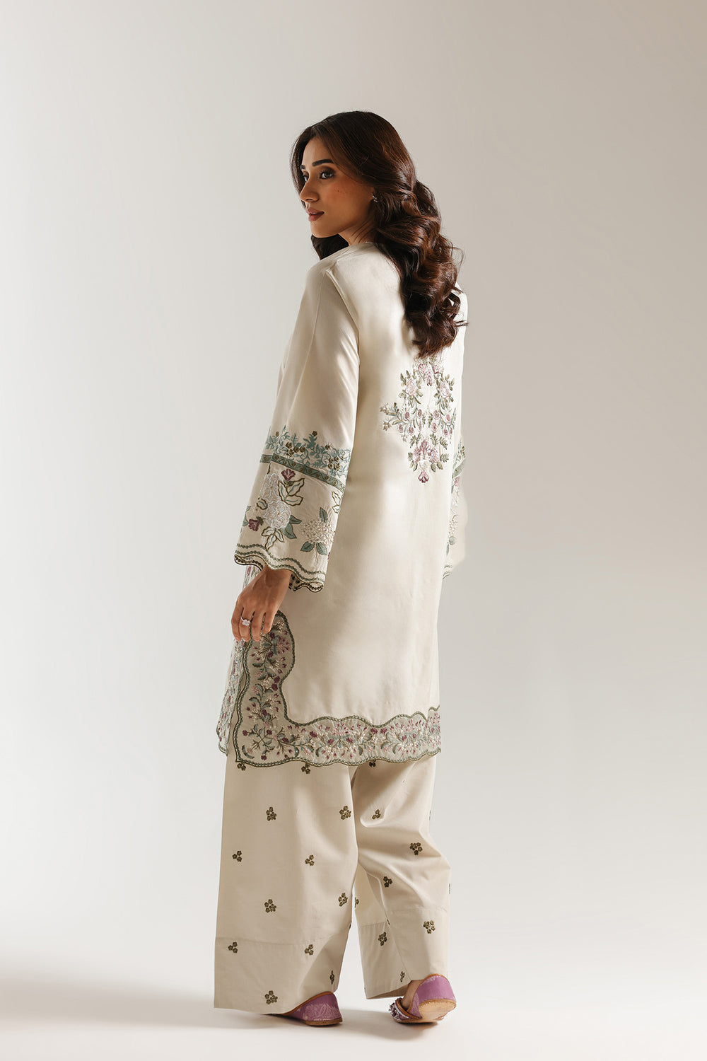 Infuse your festive wardrobe with the serene elegance of this stunning two-piece ensemble, rendered in a sophisticated creamy vanilla tone. The shirt is a masterpiece of delicate craftsmanship, featuring a refined split V-neckline intricately framed with sage green and muted plum floral embroidery. A lush garden of blooming wildflowers and trailing vines anchors the lower bodice, while the scalloped hemline is finished with dense, tonal threadwork for a regal touch. The statement bell sleeves mirror this botanical artistry, showcasing lush floral embroidery and sheer lace inserts that culminate in a graceful scalloped edge. This ensemble is perfectly balanced by voluminous, wide-leg shalwar adorned with a dainty, all-over floral spring print, offering a polished and modern silhouette. Whether attending an intimate daytime gathering or an elegant celebration, this suit provides a refreshing and timeless presence.