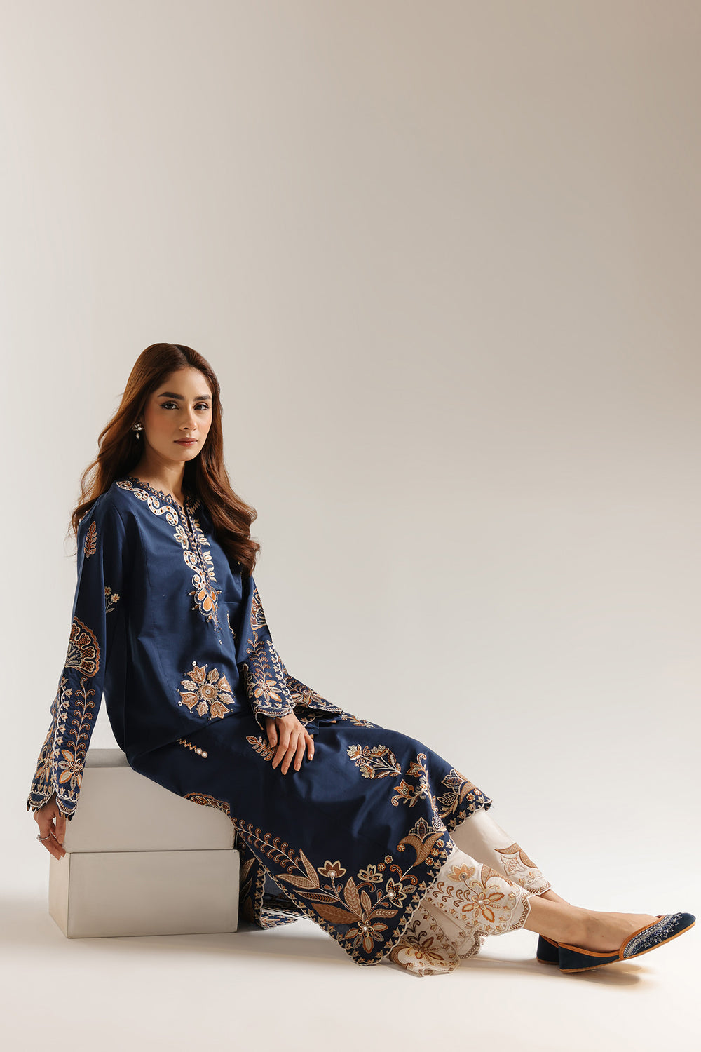 Command attention in this sophisticated two-piece ensemble, rendered in a deep, lustrous midnight blue that serves as a majestic canvas for intricate copper and gold artistry. The long shirt features a refined split neckline adorned with elaborate ethnic threadwork and shimmering mirror-style accents that catch the light with every movement. Its dramatic statement sleeves are a vision of craftsmanship, boasting dense floral embroidery and swirling vines that culminate in a delicate scalloped edge. This architectural aesthetic is mirrored at the hemline, where a continuous border of traditional motifs provides a weighted, regal finish to the fluid silhouette. The look is beautifully balanced by crisp cream trouser, which feature a coordinating oversized floral print at the ankles to ensure a polished and cohesive appearance. Perfect for evening festivities or formal cultural celebrations, this suit offers a presence that is both timeless and undeniably bold.
