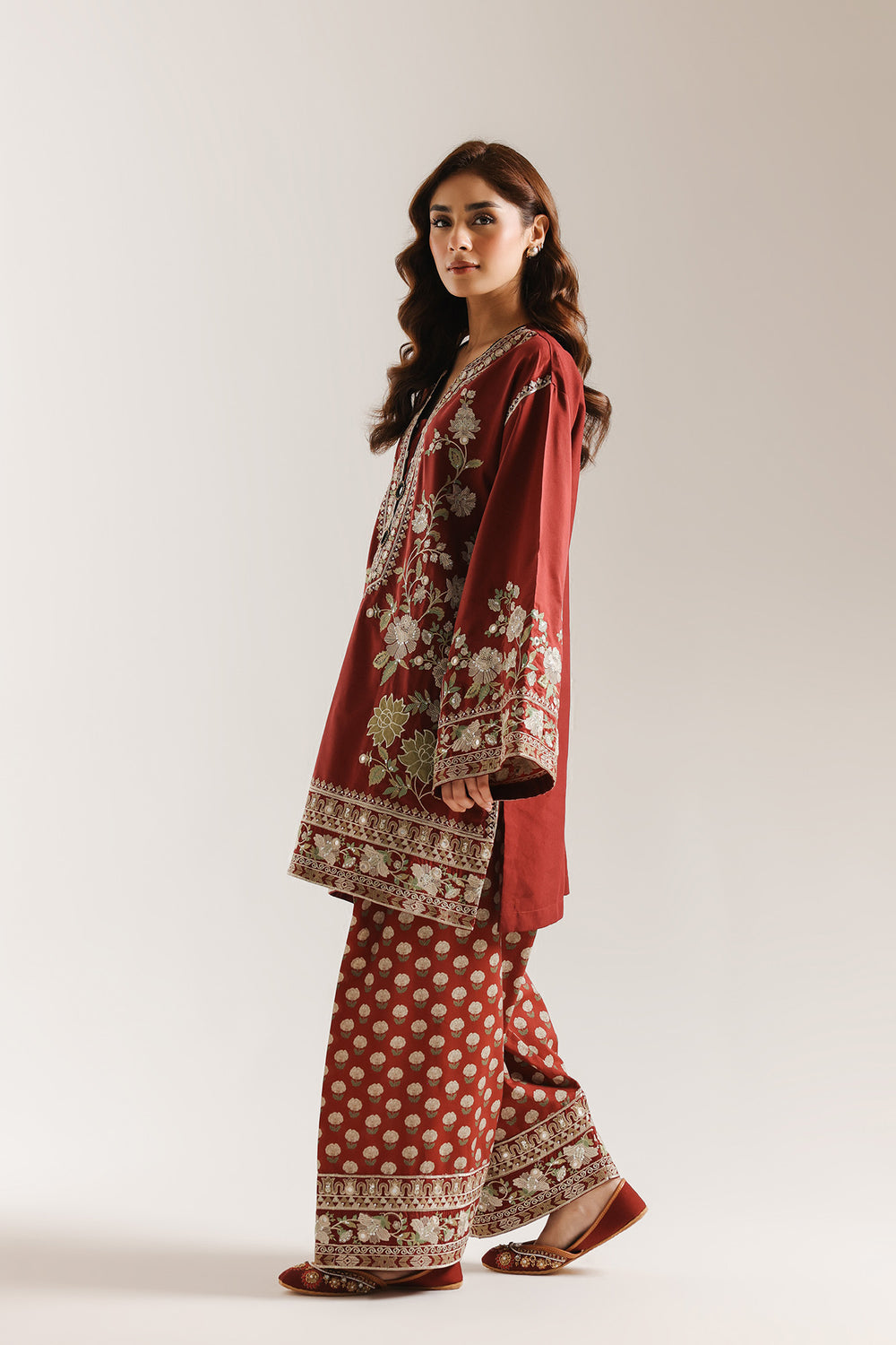 Revel in the luxurious warmth of this deep garnet-toned ensemble, a masterpiece of traditional craftsmanship and contemporary flair. The shirt features a sophisticated split neckline, lavishly framed with silver and ivory ethnic embroidery and finished with bold, oversized accents. Delicate floral sprigs are scattered across the bodice, leading to statement wide sleeves that are heavily embellished with lush botanical threadwork and intricate geometric borders. This artisanal theme is mirrored at the hemline, where a broad, ornate border provides a weighted and regal finish to the silhouette. The ensemble is perfectly paired with voluminous, wide-leg shalwar featuring a charming all-over floral polka-dot print in a matching hue, also finished with coordinating embroidered borders at the ankles. Effortlessly elegant and rich in detail, this suit is a premier choice for festive evening gatherings and cultural celebrations.