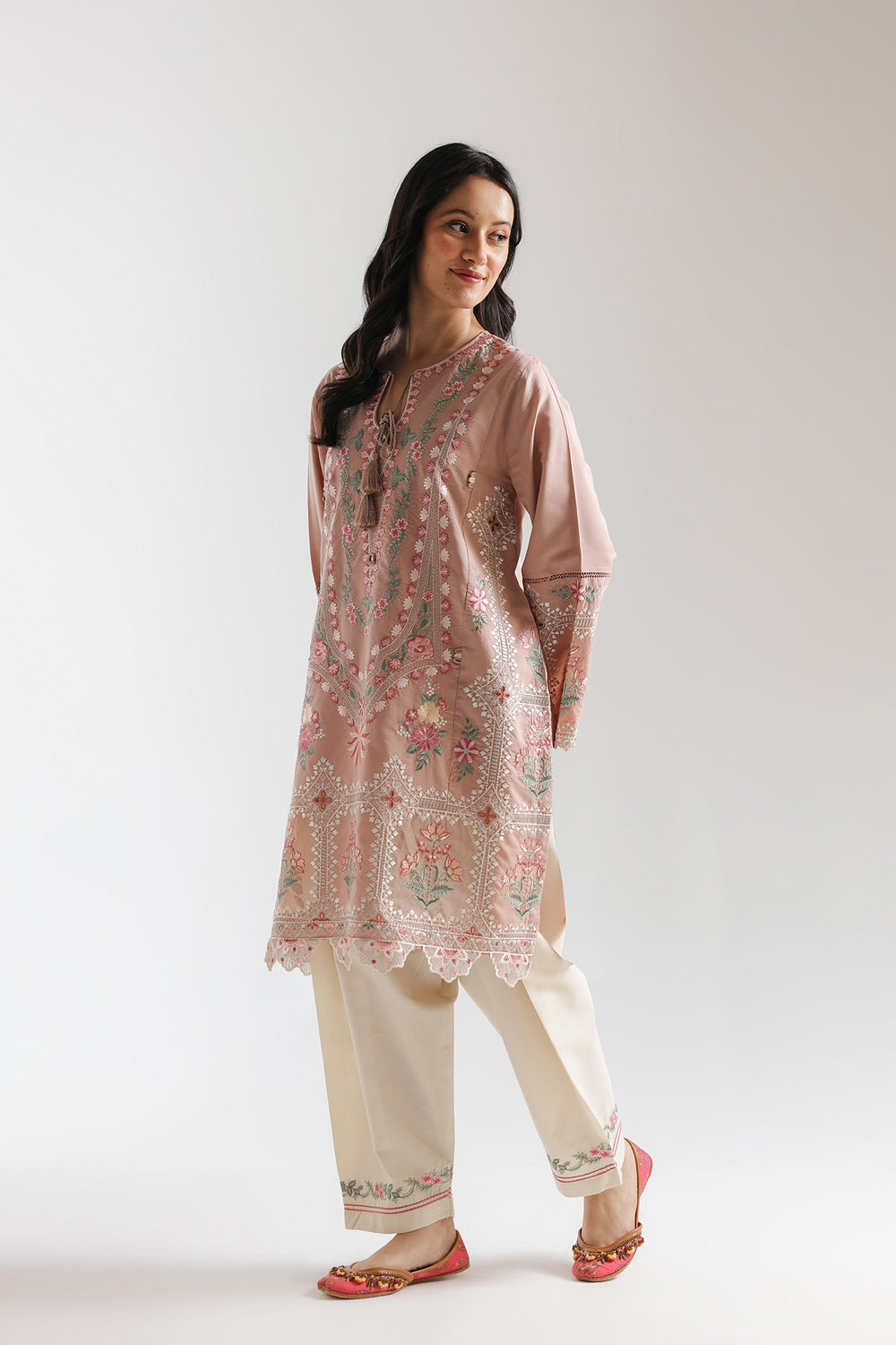 Step into a world of romantic elegance with this stunning two-piece ensemble, rendered in a sophisticated dusty rose hue that exudes soft, feminine charm. The shirt is a masterpiece of artisanal detail, featuring a refined split neckline adorned with delicate tasseled ties and a lush garden of pink, sage, and ivory floral embroidery. Intricate vine motifs and architectural threadwork flow gracefully down the bodice, culminating in a dramatic scalloped hemline that adds a layer of whimsical texture. This ensemble is beautifully balanced by loose-fit cream shalwar, which feature a dainty pink floral border at the ankles to ensure a polished and cohesive look. Perfectly suited for garden brunches or festive daytime celebrations, this suit offers a silhouette that is both timelessly elegant and effortlessly chic.