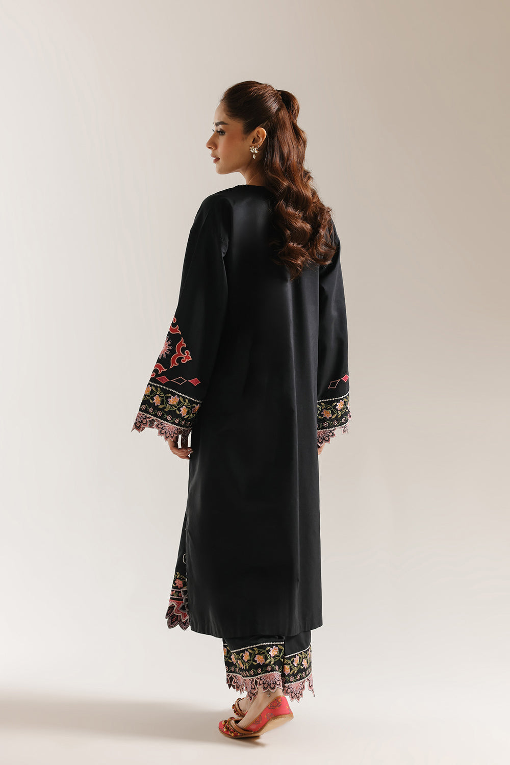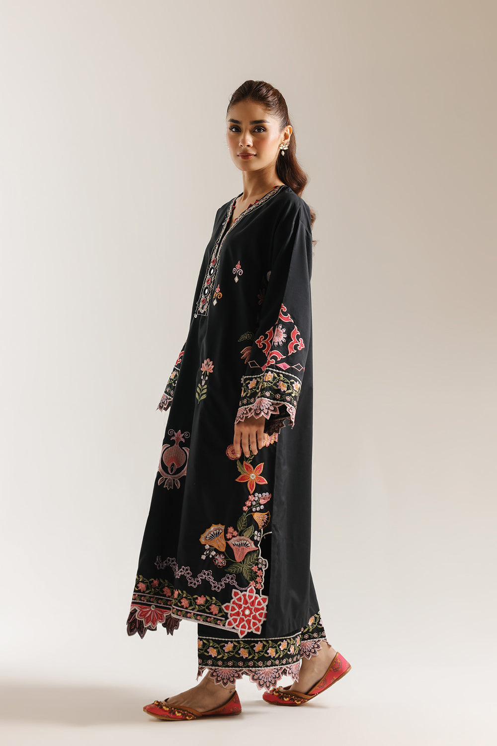 Command the room in this striking black ensemble, a masterclass in high-contrast artistry and traditional craftsmanship. The long shirt features a sophisticated split neckline intricately framed with silver threadwork and bold, red-rimmed button accents. Scattered across the dark canvas are whimsical floral sprigs and geometric "diamond" motifs in shades of blush pink, coral, and sage green. The true highlights of the piece are the elaborate scalloped borders found on both the wide statement sleeves and the hemline. These borders showcase dense botanical embroidery and large-scale lotus-inspired patterns that provide a regal, weighted finish to the fluid silhouette. The look is beautifully completed with matching black wide-leg trousers, featuring coordinating floral bands and dramatic scalloped edges at the ankles for a polished, head-to-toe festive aesthetic.