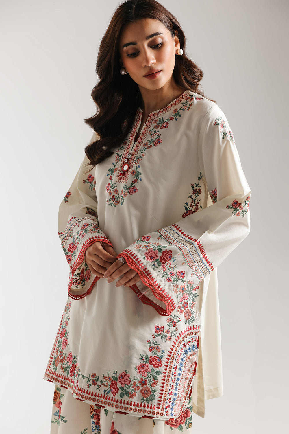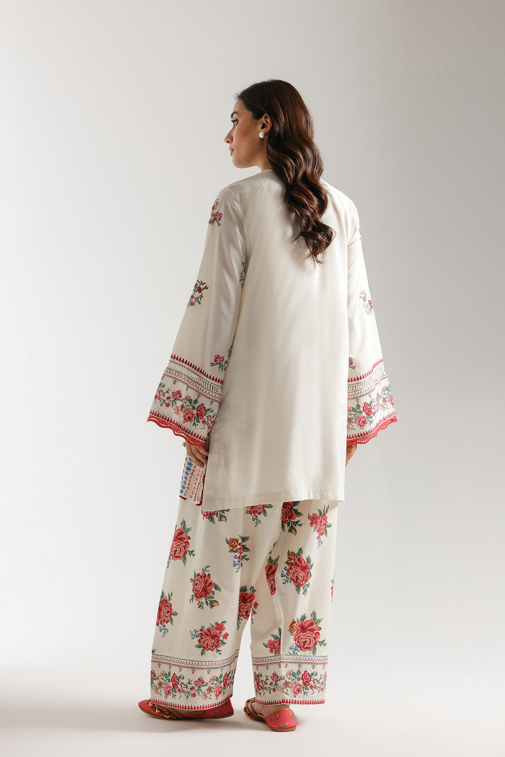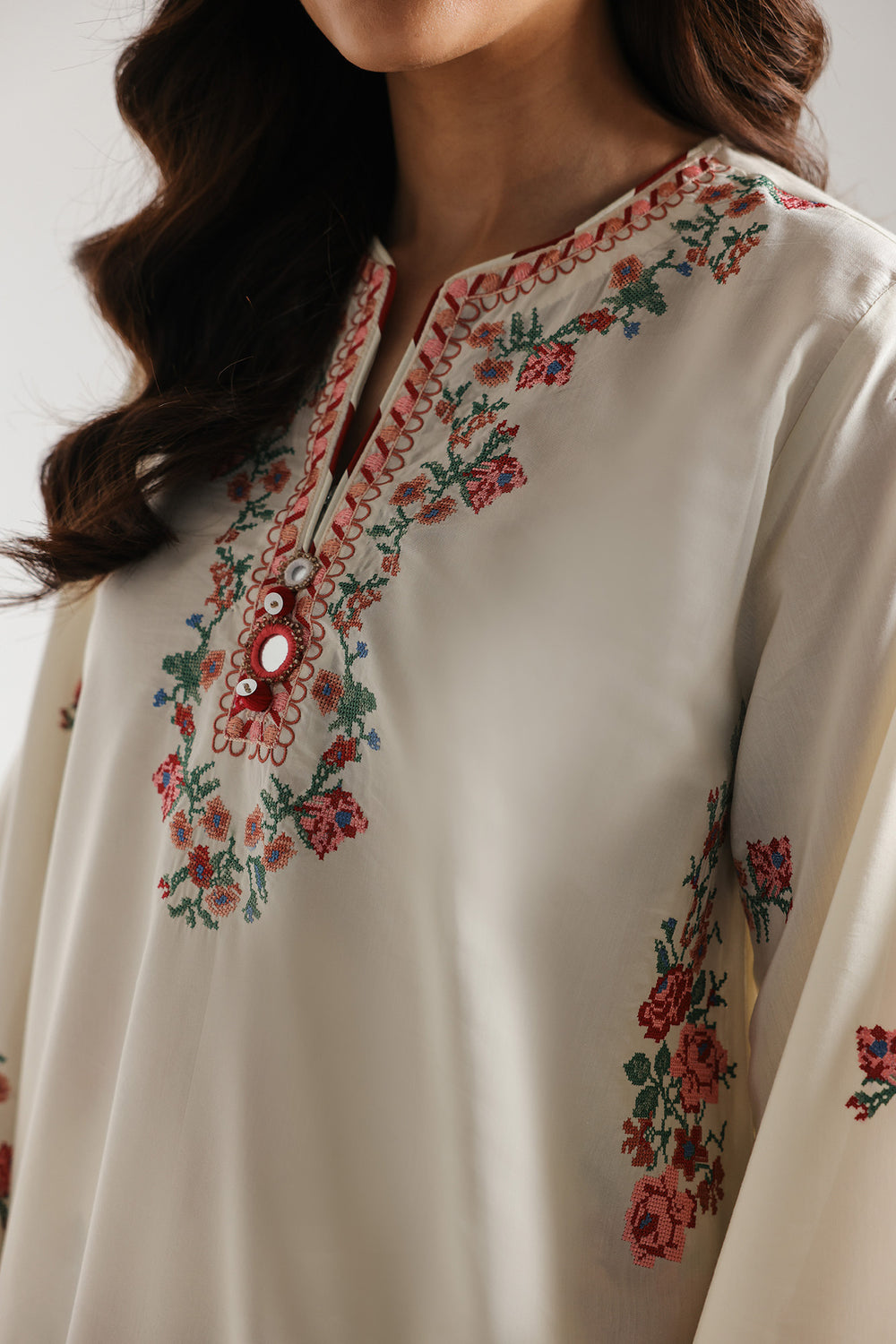 Exude an air of timeless sophistication in this ivory embroidered suit, featuring a long-line tunic with a relaxed and fluid silhouette. The design is centered around a delicate split neckline, which is intricately detailed with floral embroidery in shades of rose pink and forest green, further accented by shimmering mirror-work. The tunic is adorned with scattered floral motifs on the sleeves and a dense, decorative embroidered border along the hemline and cuffs, finished with a playful red lace trim. It is perfectly coordinated with matching ivory wide-leg shalwar that feature a vibrant, all-over rose print and a coordinating border at the ankles.